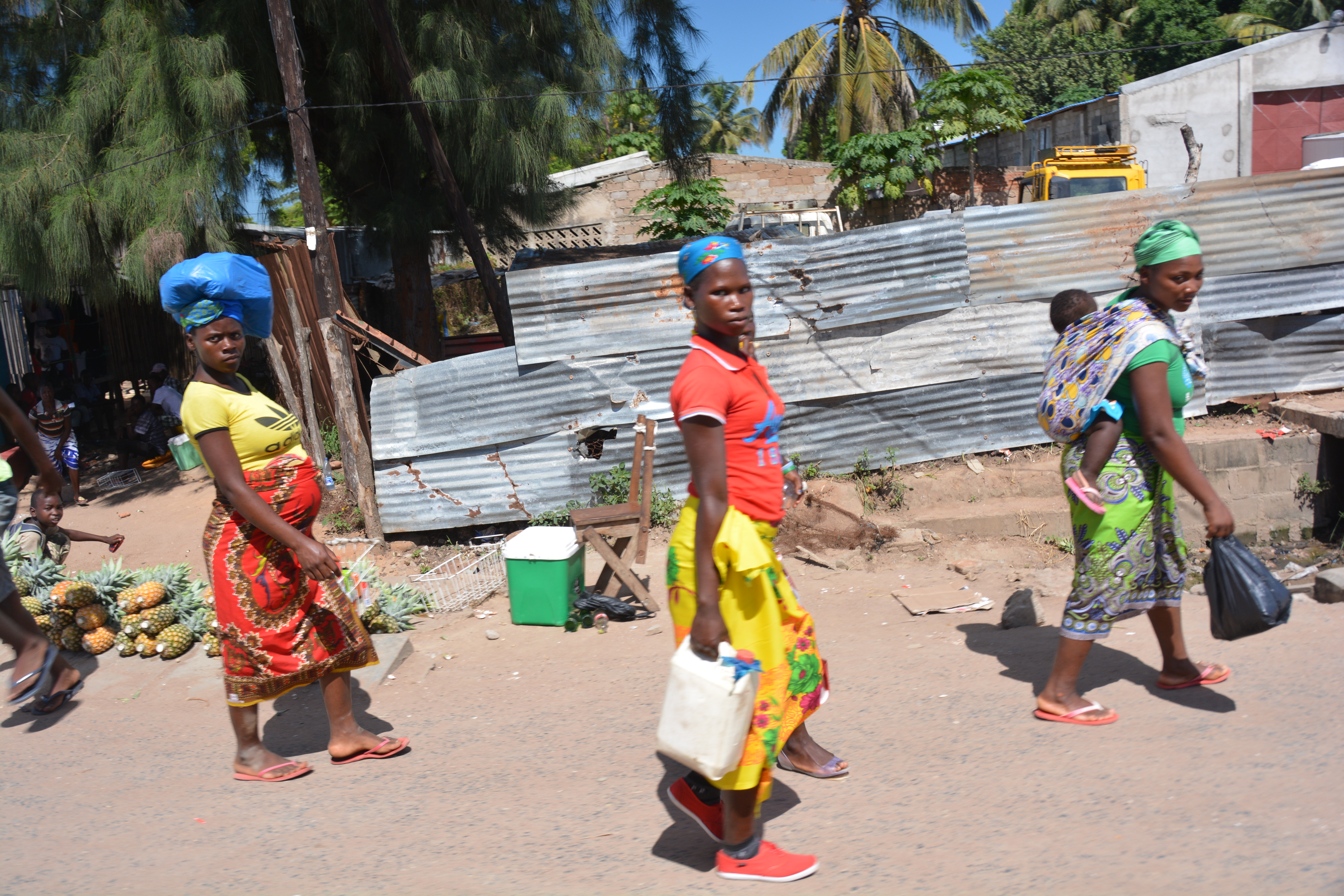 This woman represents the hardworking females of Mozambique – looking stylish while carrying a big load on her head and her baby on her back