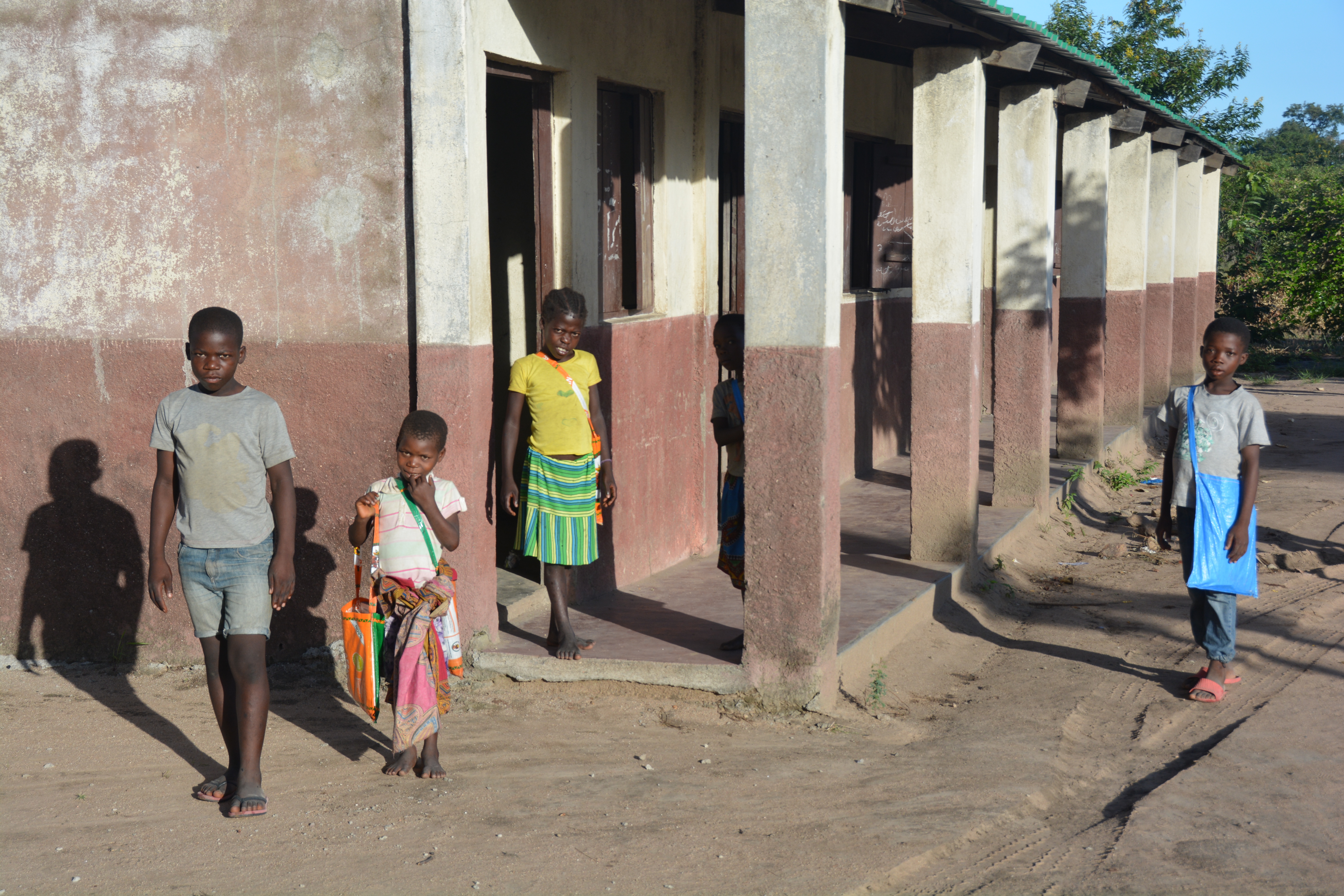 The next morning some kids show up for school – not all of them have shoes but check out their little school bags