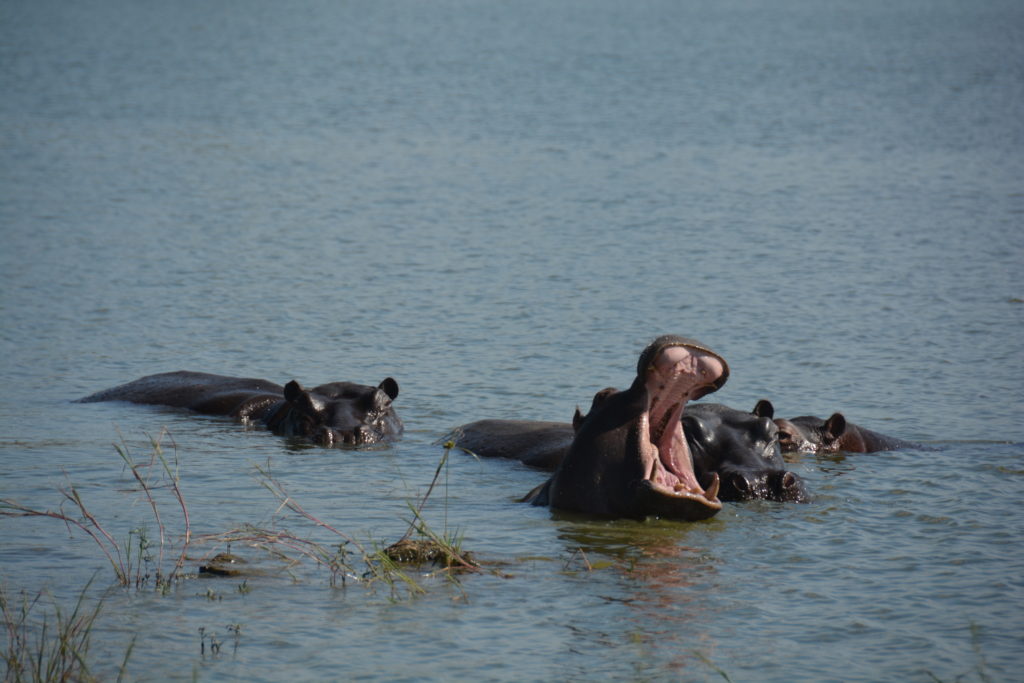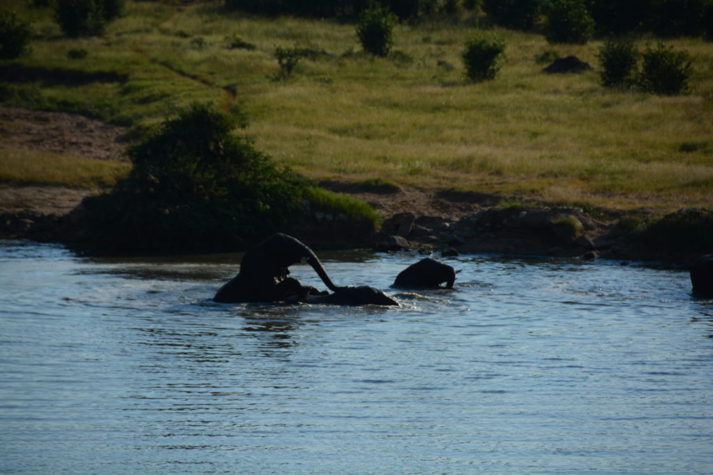 That evening at our fire we could hear Africa all around us. A mother and tiny baby hippo grazed on the slope just metres from us, more elephants came down to the water to loudly splash about and we knew the lions were close because of their frequent and fearsome roars announcing their presence. When we started hearing loud roars from all directions, and knowing our ‘enclosed’ structure was missing about half its fence, we opted for the safety of Tramp’s bed. What a night!