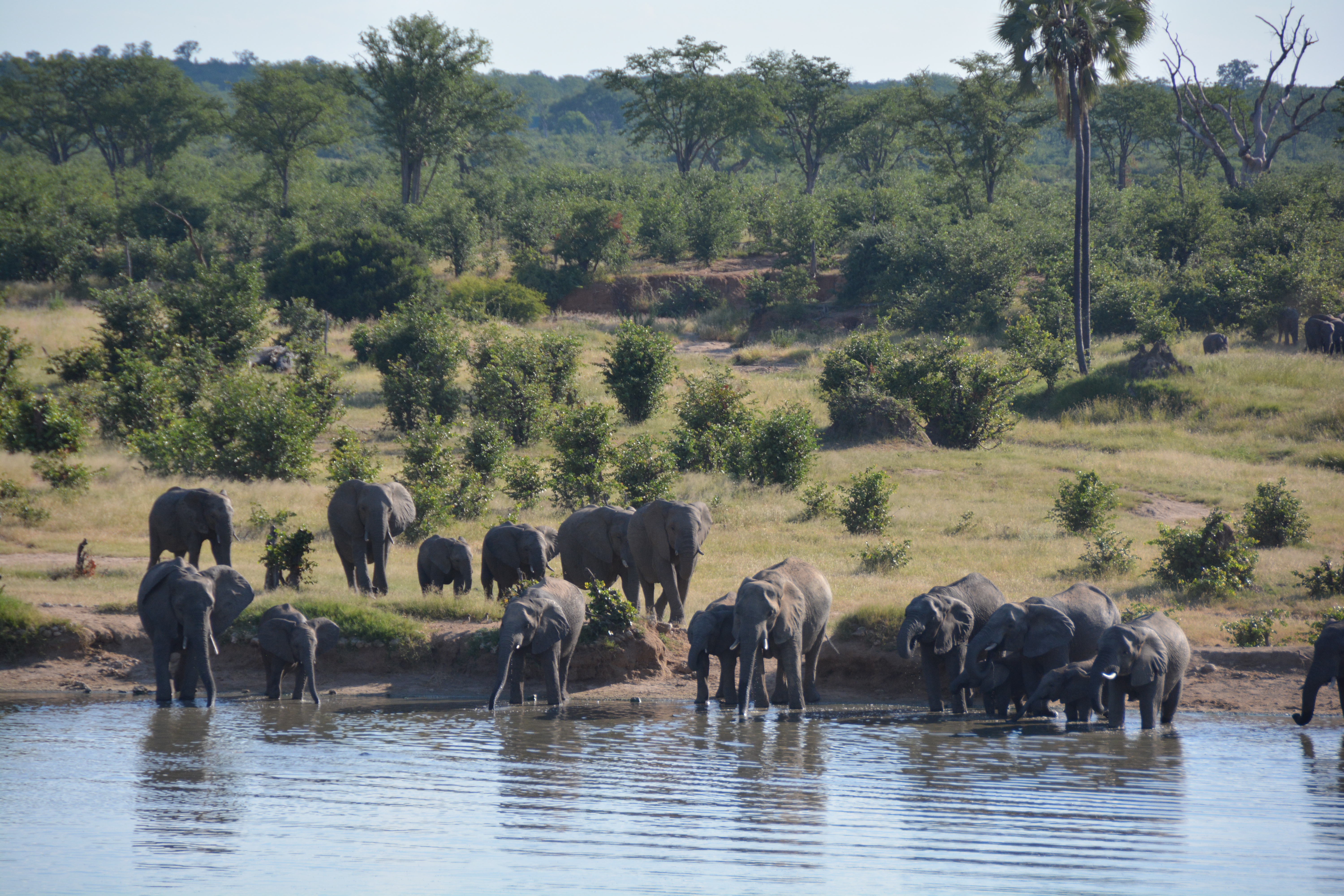 Then it was through a huge and ugly mining complex and into Hwange National Park. We drove for some time, including a lunch stop at an old campsite, before we saw any animals. At a waterhole, always our favourite place when we’re on a hunt, we saw herds of elephants and rafts of hippos all doing their thing in the water in the 38C/101F African heat. Hwange National park is said to have 40,000 elephants and it seemed for a second they were all here. In the end we counted about 80 elephants in all and had to wait while one herd of these magnificent pachyderms slowly made their way across our track, being careful not to annoy them too much.