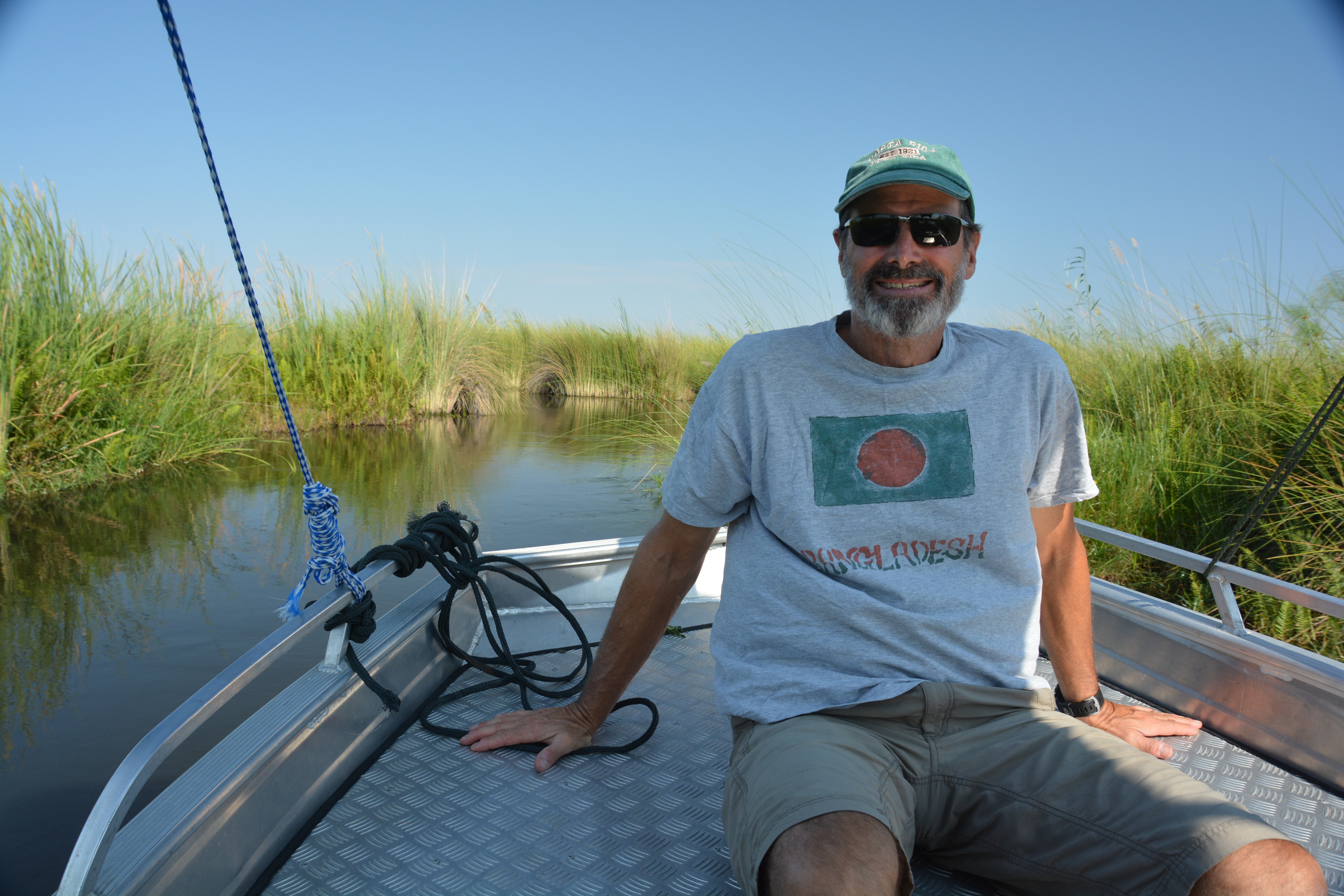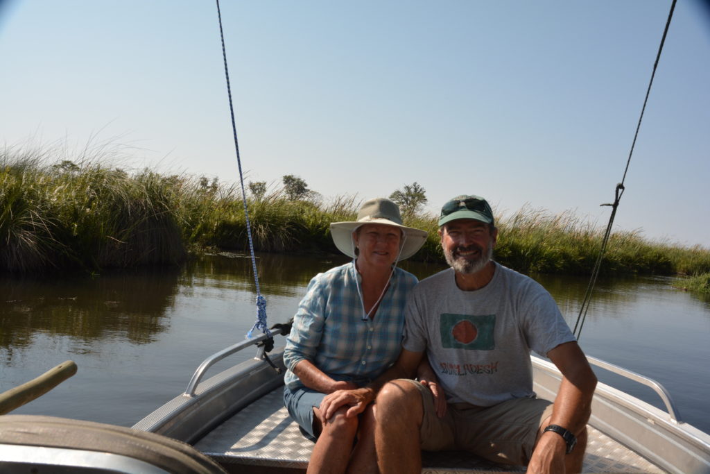 That night we camped at a place called Third Bridge, another $100 campsite, on the edge of a small waterway. The next morning we hired a motorised boat to take us up the waterway and see the delta from another perspective. This was very cool, following a narrow channel through the reeds and grasses, past startled hippos, scattering colourful birds, learning from David our guide about how the locals use the dozens of grasses that grow in the Delta to build their houses, cook for food, turn into medicine. The boat trip opened our eyes to the power and importance of the water flowing into the delta and gave us a brief insight into the lives of the local people.