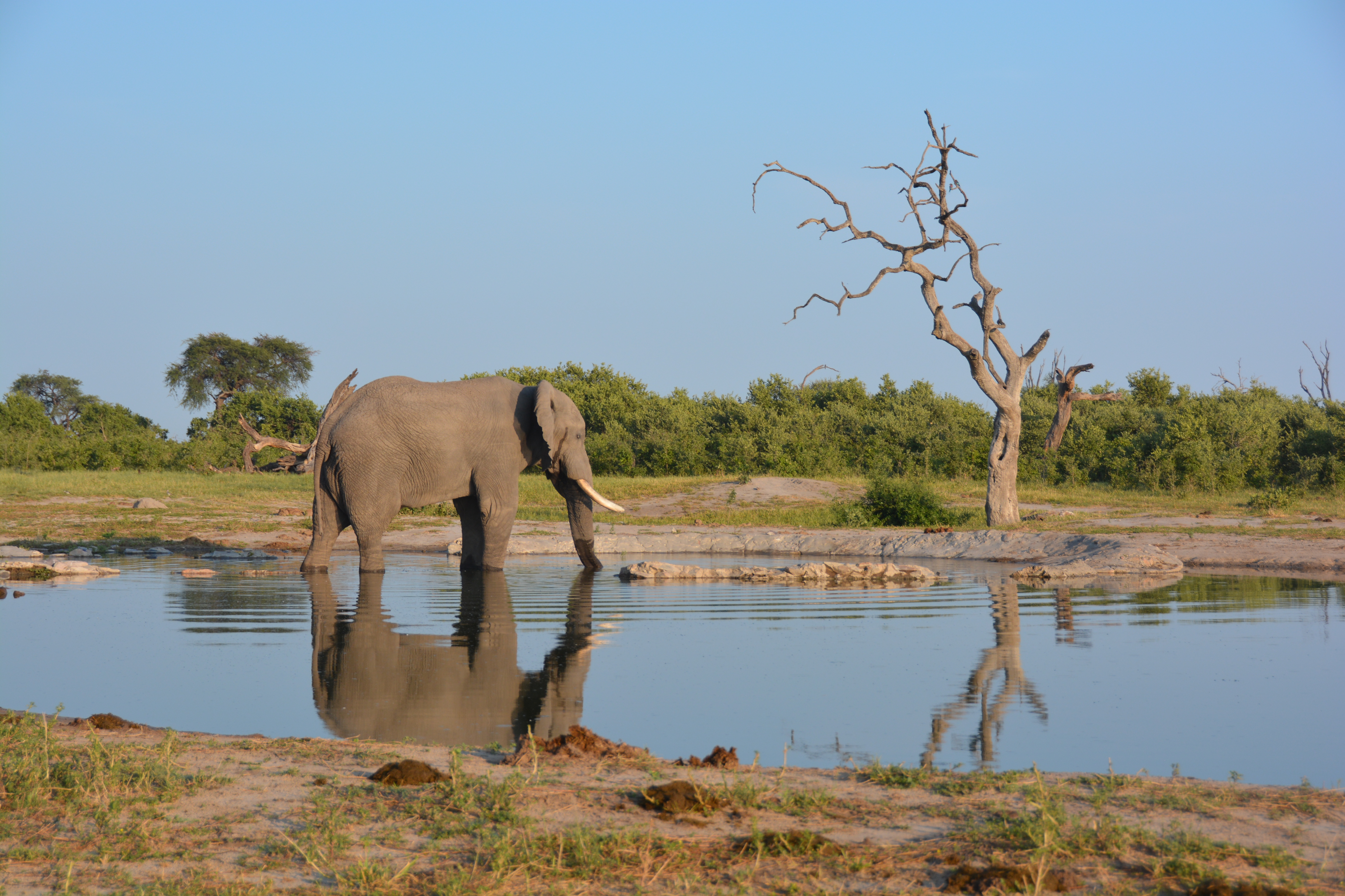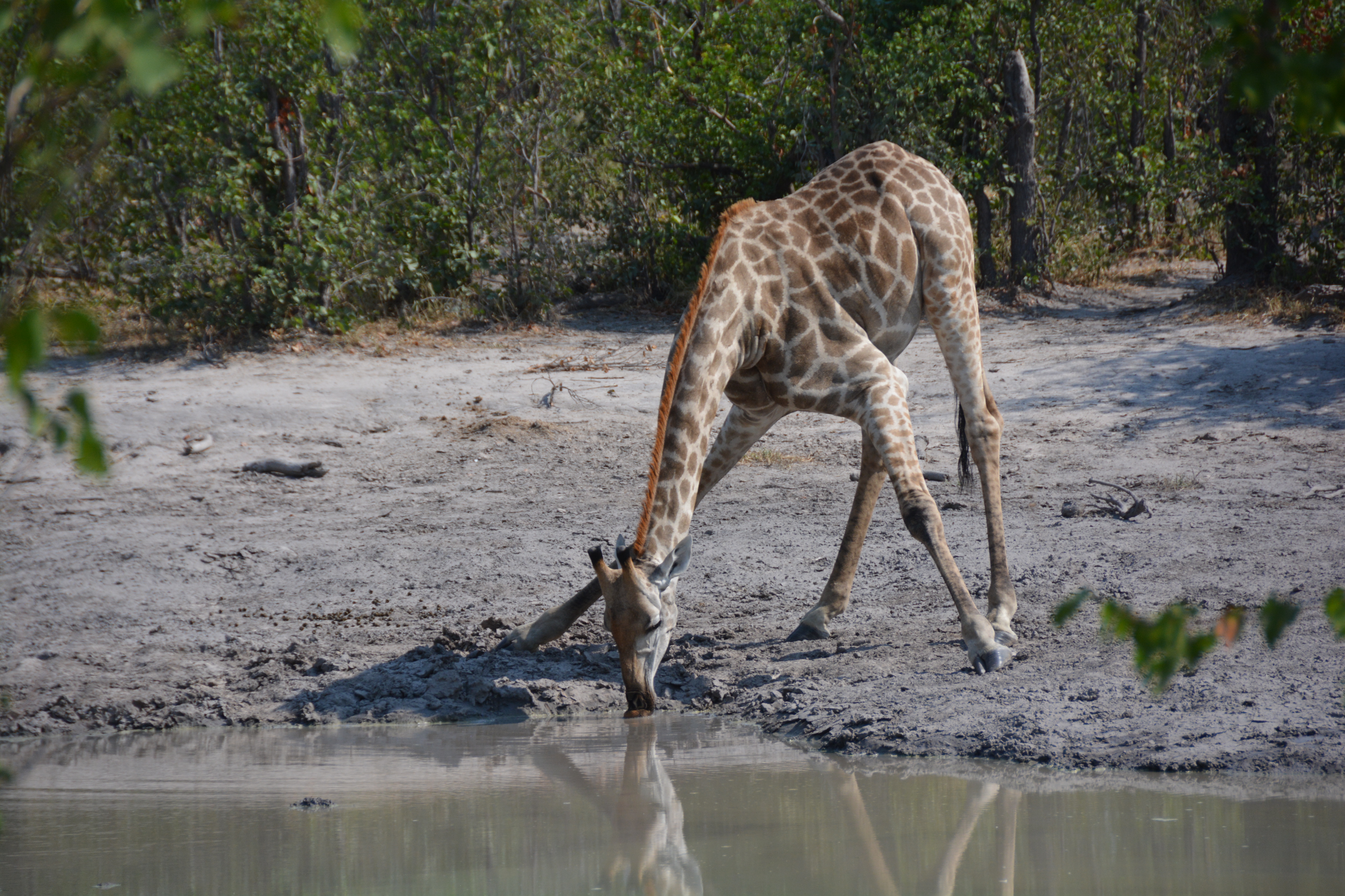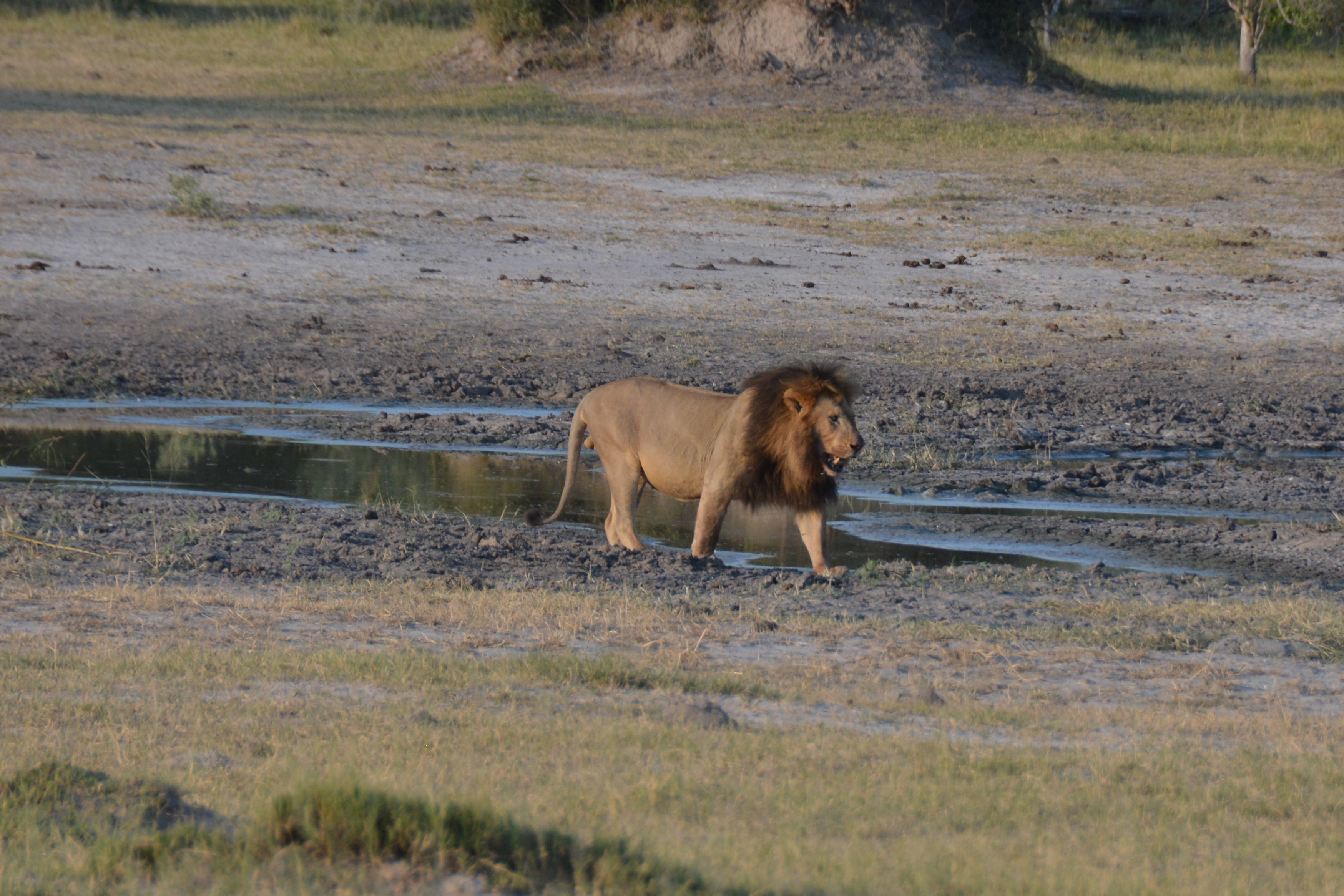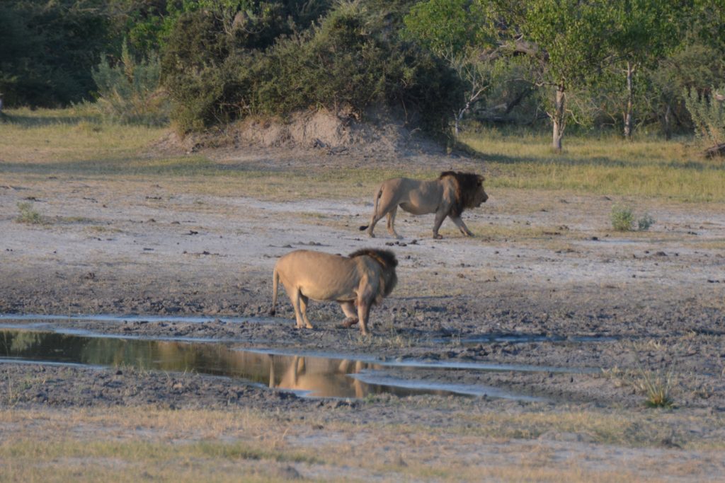 We spent the day driving around and through the park, mainly looking for lions, negotiating the uber narrow tracks that left many Botswana racing stripes on the sides of Tramp, when only a kilometre from camp we finally found two beautiful male lions who had gorged themselves on a kill and were looking for a drink. These are magnificent beasts, the kings of the jungle, huge animals that send the rest of the animal kingdom scampering for cover. We loved it.