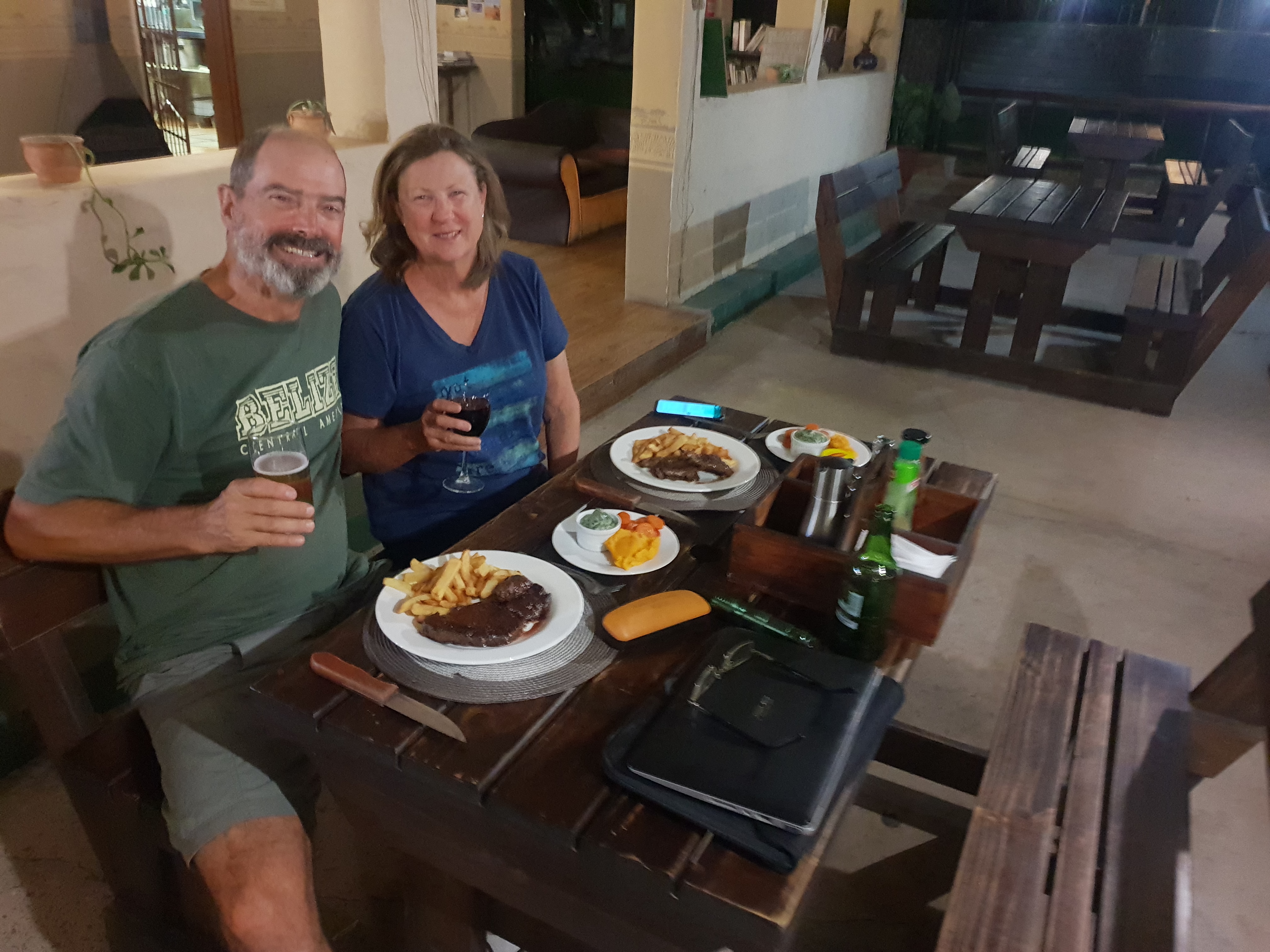 We chose a campsite that night which had a restaurant featuring local wild game and we celebrated our five days in the Kalahari by eating what we enjoyed most – Julie had Impala chops while I chose a Gemsbok steak. As you do.