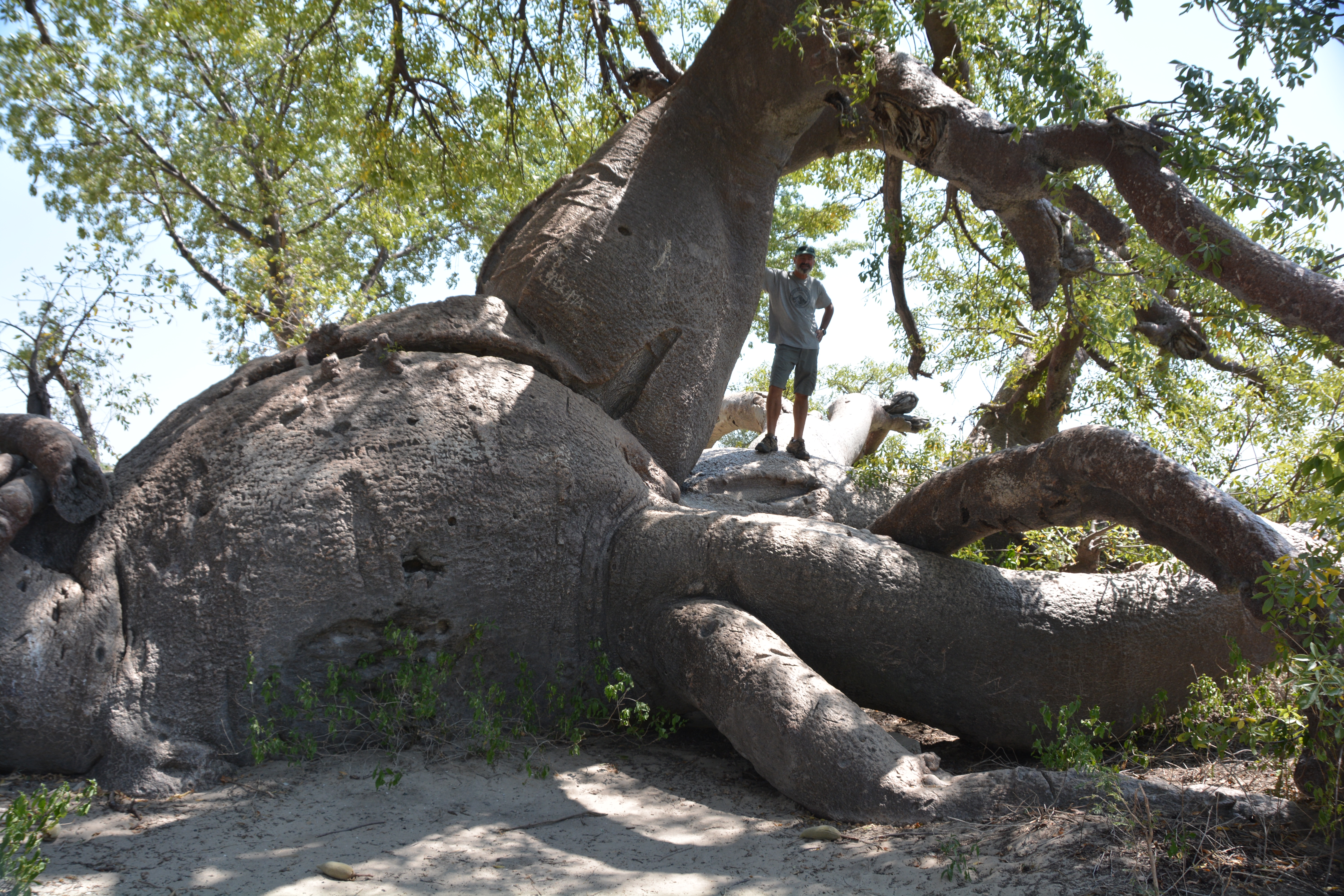 Not done with baobabs or narrow unrecognisable sandy tracks, we continued on to Chapman’s Baobab, named after his discoverer in the 1860’s, said to have a girth of 25 metres (over 80 feet) before it split in three pieces and fell down a few years ago. Amazingly, the tree is still alive and continues to sprout new branches, even though visitors like Julie and I climb all over it. Said to be between 500 and 4,000 years old, depending on your source, Chapman’s Baobab sets a high bar for size and remoteness.