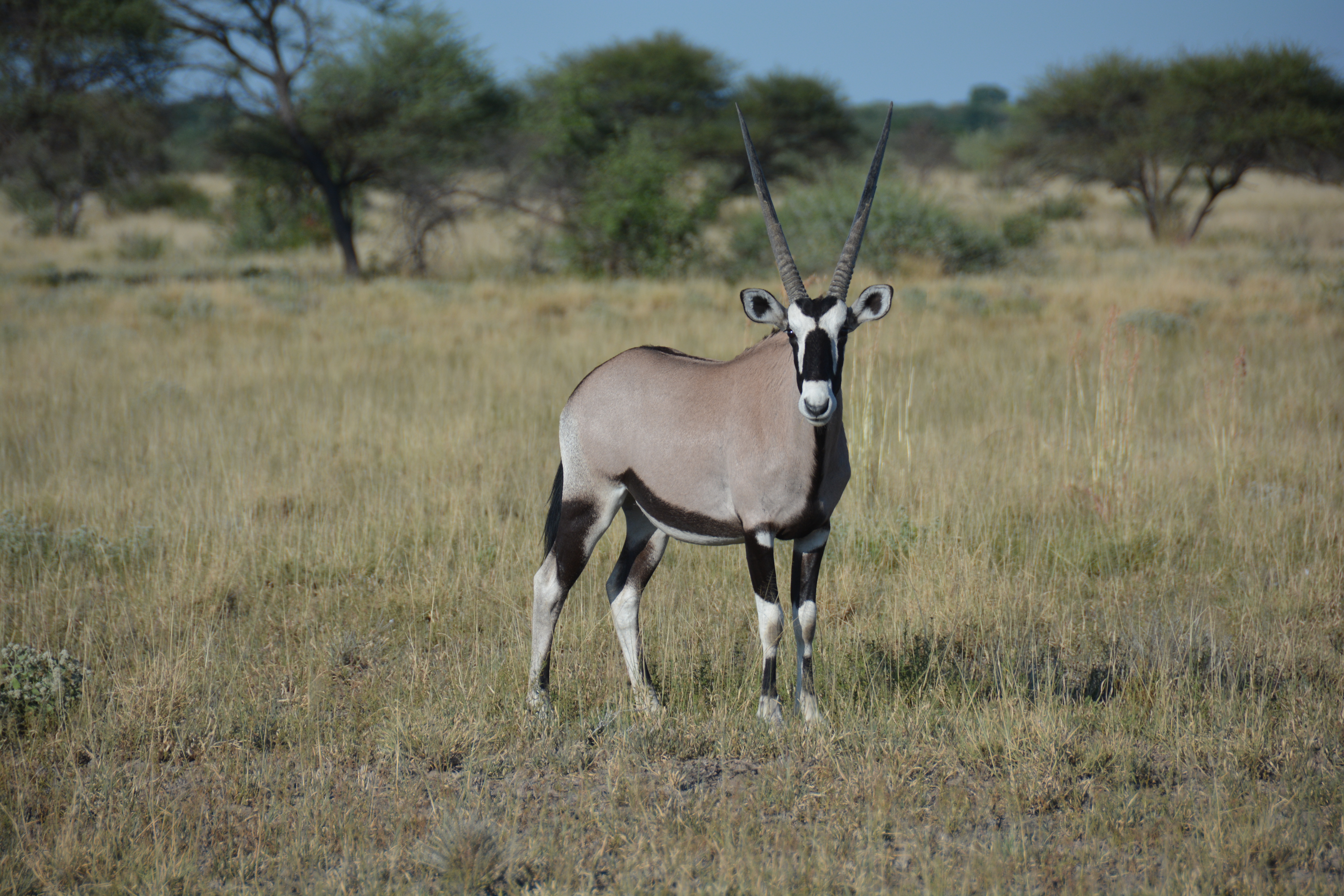 We drove further north through the park’s desert scrub, the land dry as the moon and only slightly more hospitable, sighting two new animals we hadn’t seen before, the lithe little Steenbok and the imposingly impressive Gemsbok. The Gemsbok has probably the finest horns of any animal in Africa, over a metre long, sticking straight up, demanding attention and respect while the animal itself features beautiful markings on his face and body, a magnificent beast.