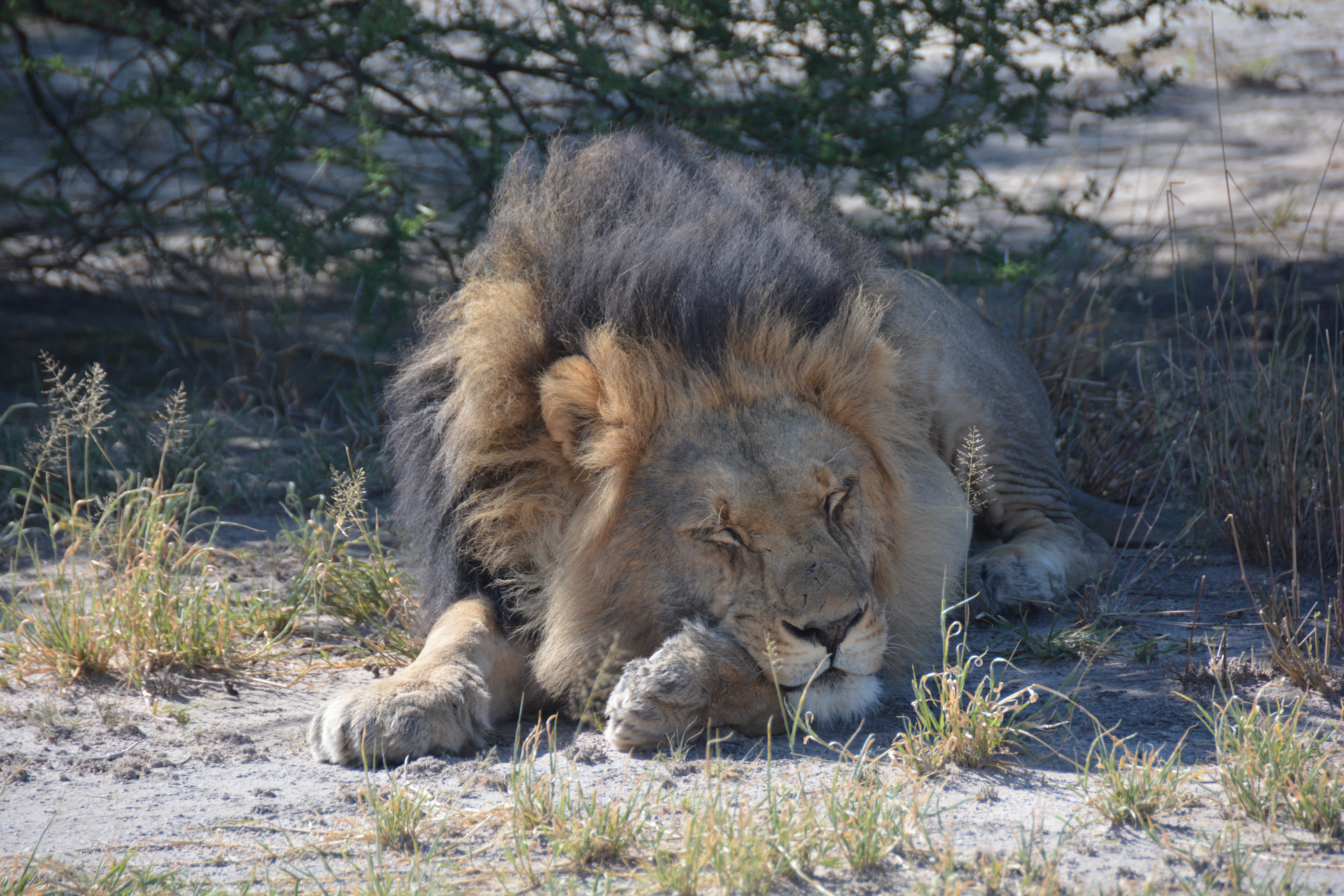 We drove south through the desert, following the track from dry pan to dry pan, spotting our first few red hartebeests as well as hundreds of wonderful gemsboks, springboks and steenboks. At one stage we found a huge male lion resting under the tree right next to the road. His mane was largely black indicating he belonged to the rare group referred to as the black lions of the Kalahari. The perfect hunting machine, this old fellow was happy for us to gaze upon him, admiring his huge and handsome features, while he slept in the shade.