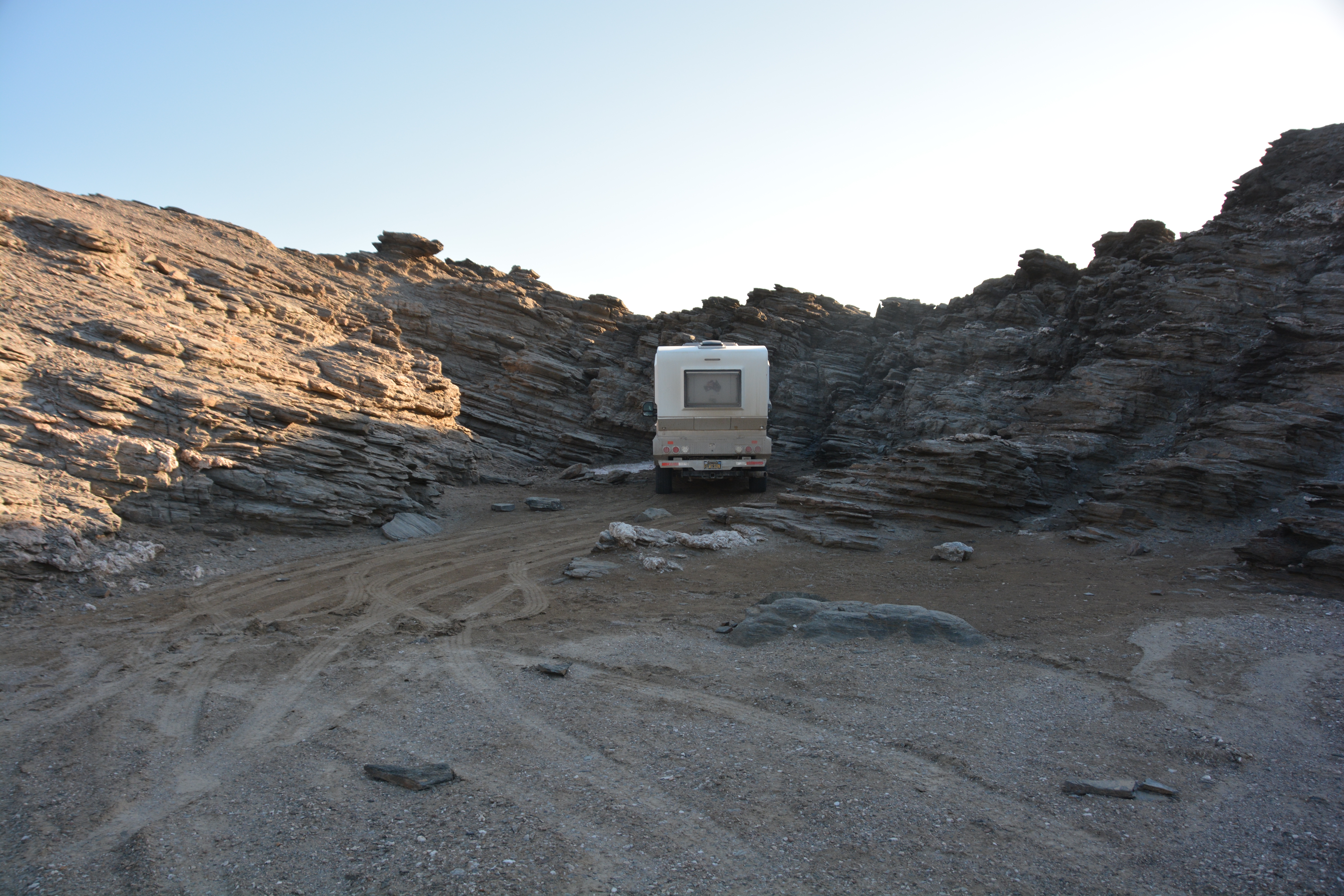 We drove out of the park and that afternoon headed ever southward, following another terrible road covered in deep washboards, the corrugation rattling us such that we could hard speak to each other. How Tramp survived it all is beyond wonder. The scenery continued to be stark but the desert gave us sharp colours of reds, oranges, yellows, greys, browns and blacks as we drove across open plains and through low mountain passes. We camped that night behind a petrol station at a remote intersection in a settlement called Betta, and so it was for betta or worst.