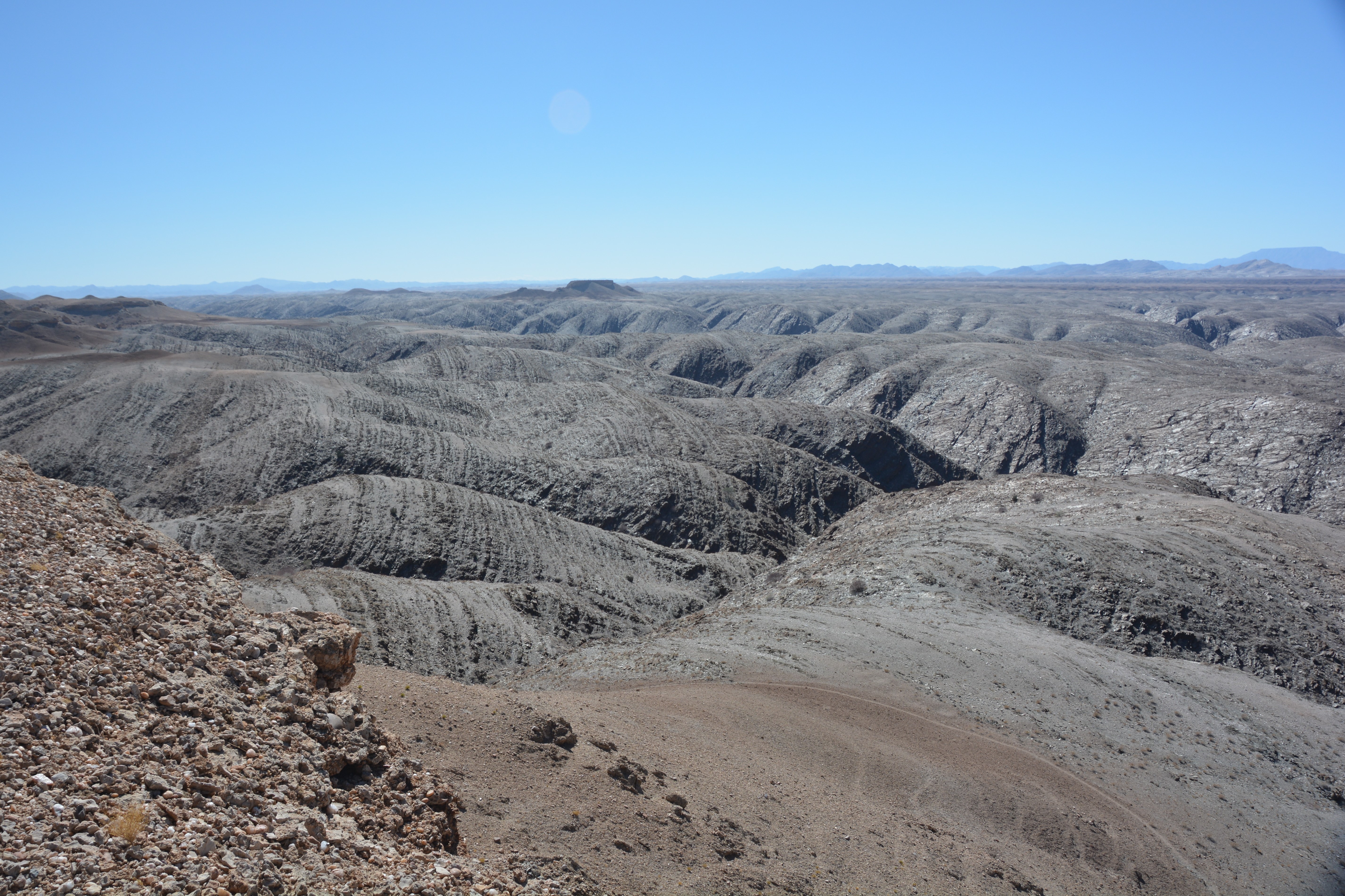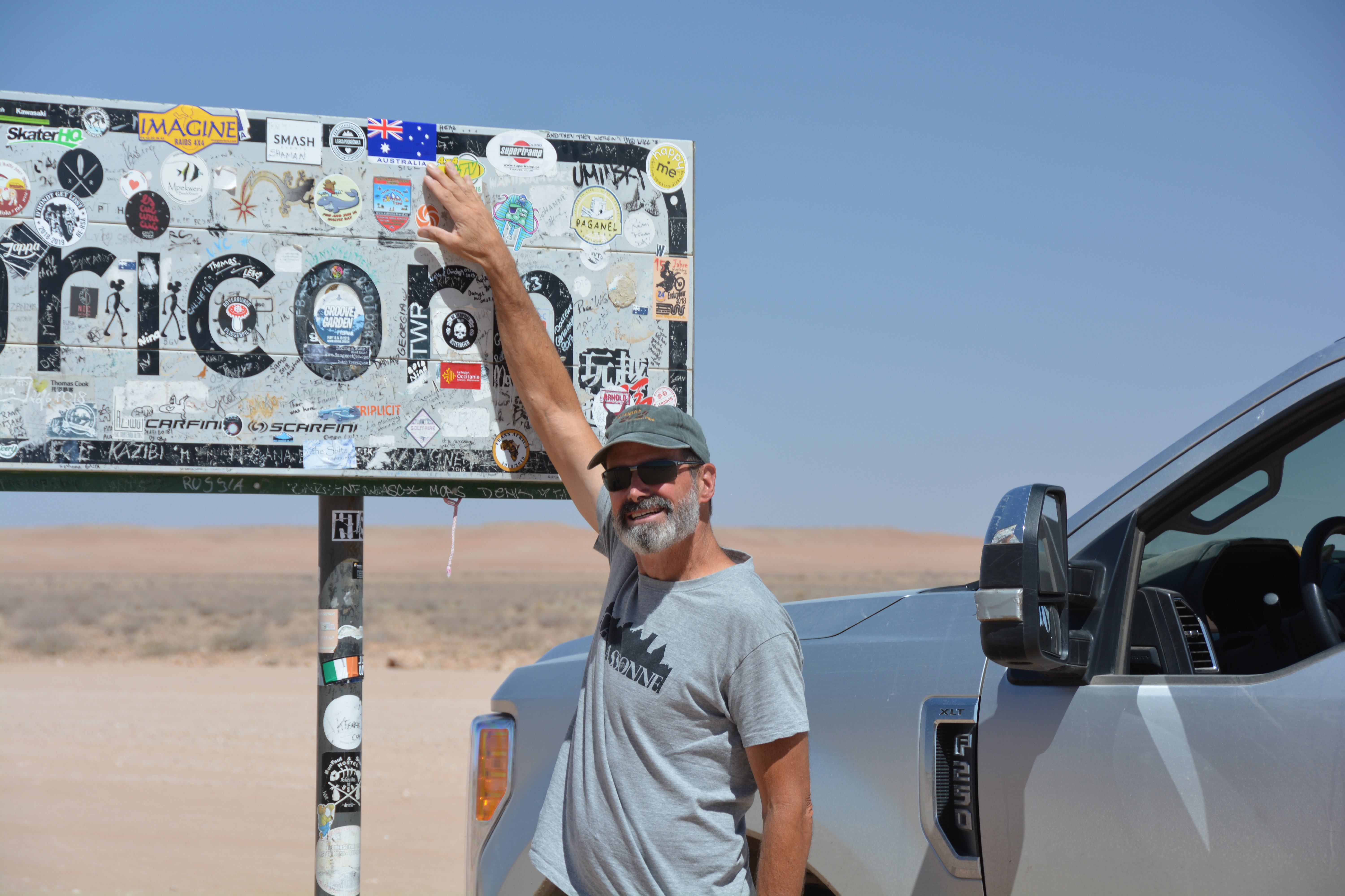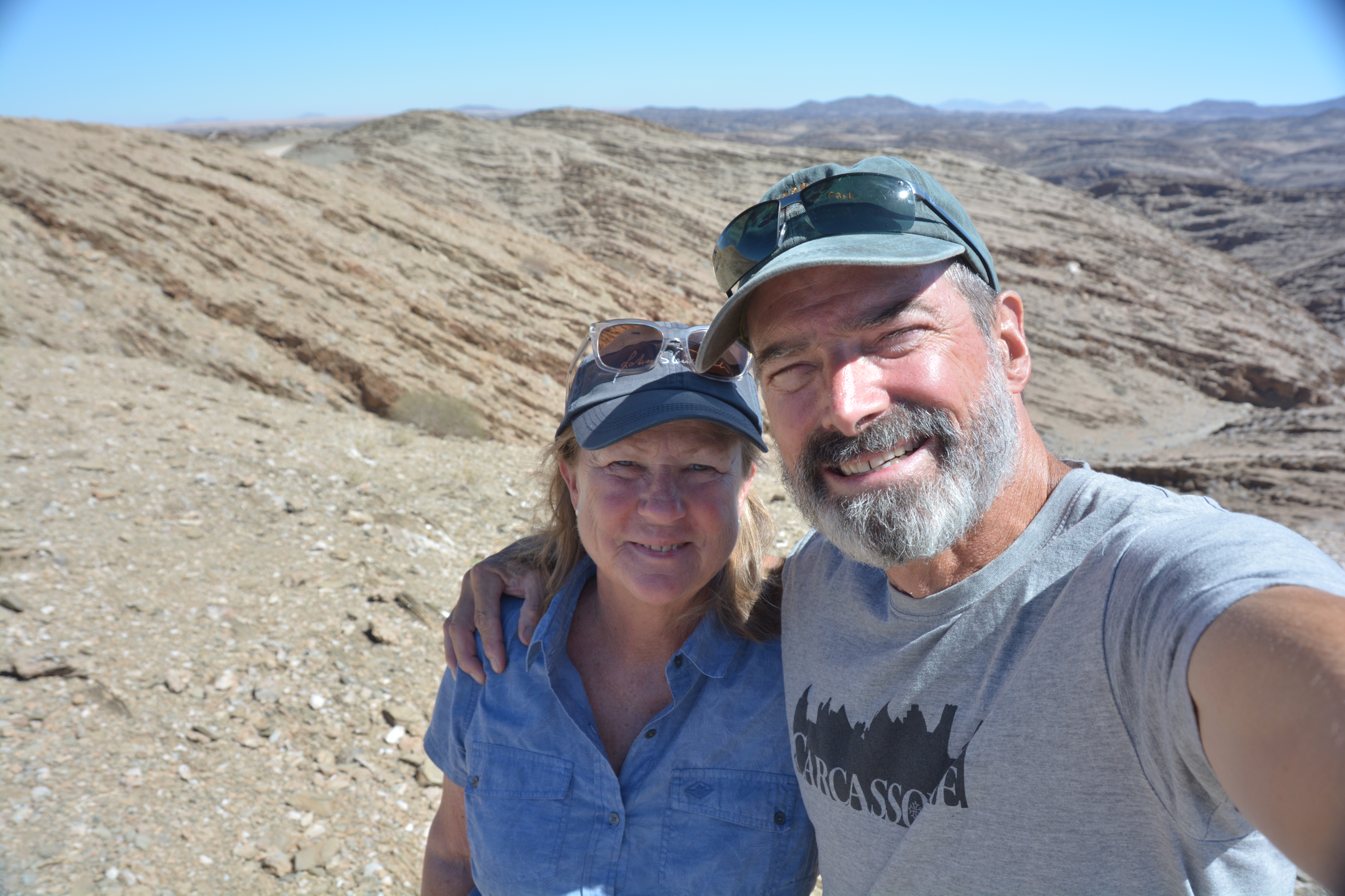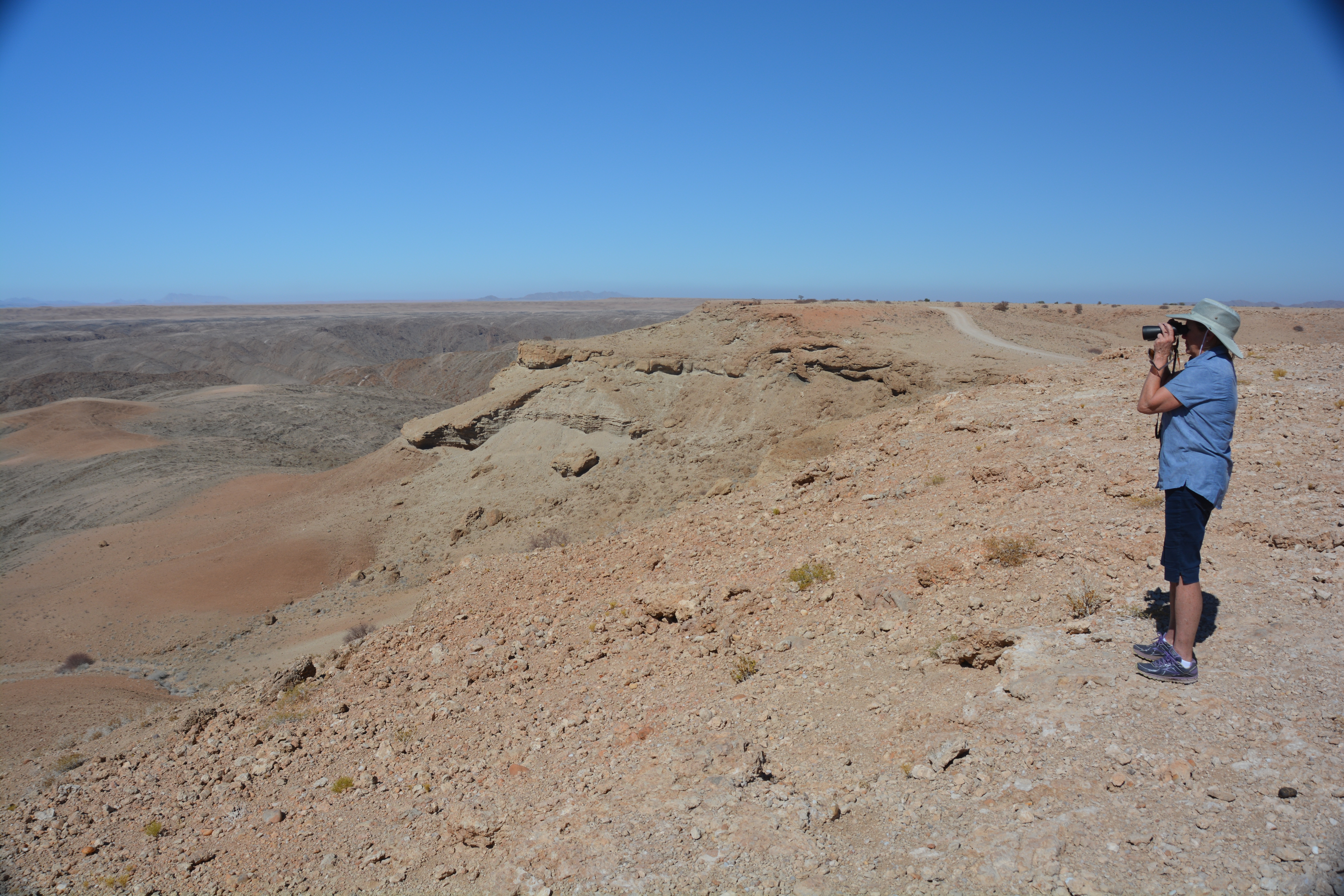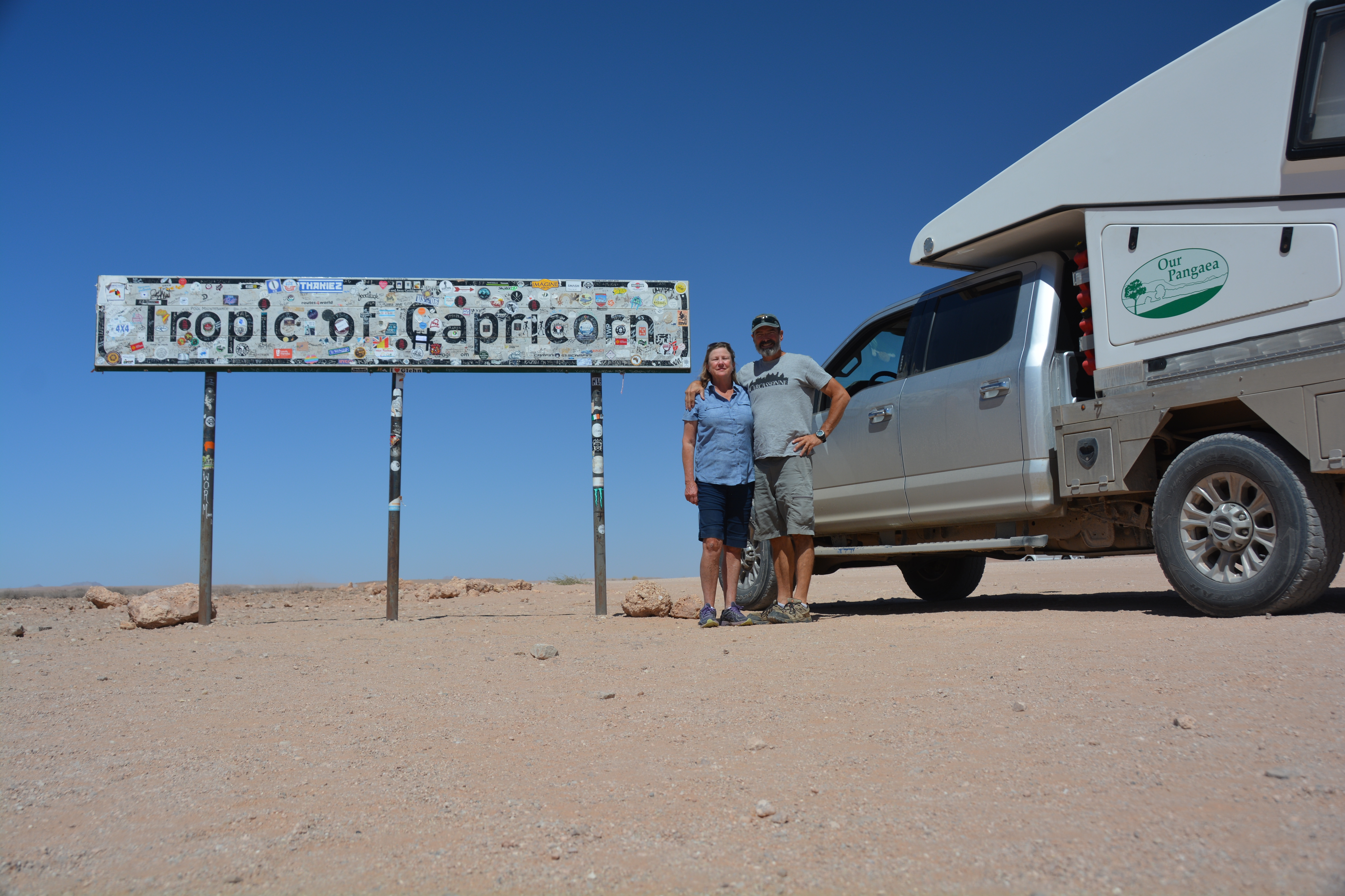 We made our way across a rough side track to the rim of Kuiseb Canyon, carved by an ancient river of the same name, now exposing the twisted and layered strata of rock millions of years old. We crossed the Tropic of Capricorn, a symbolic line on the map which we last crossed heading northward a couple of months ago in Mozambique when the sign was in Portuguese.