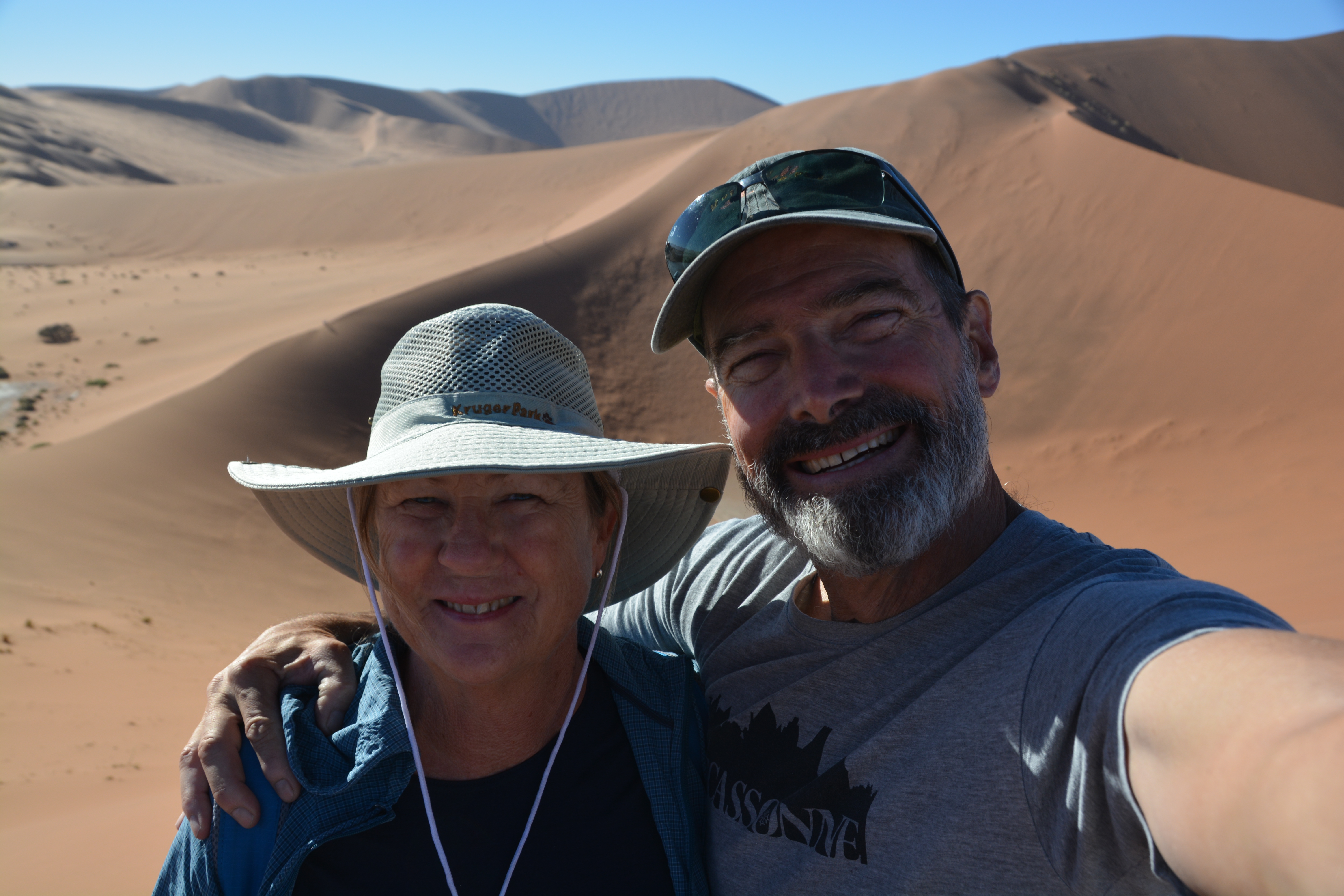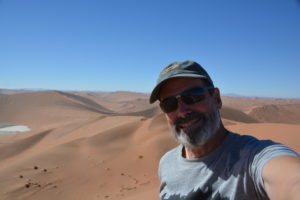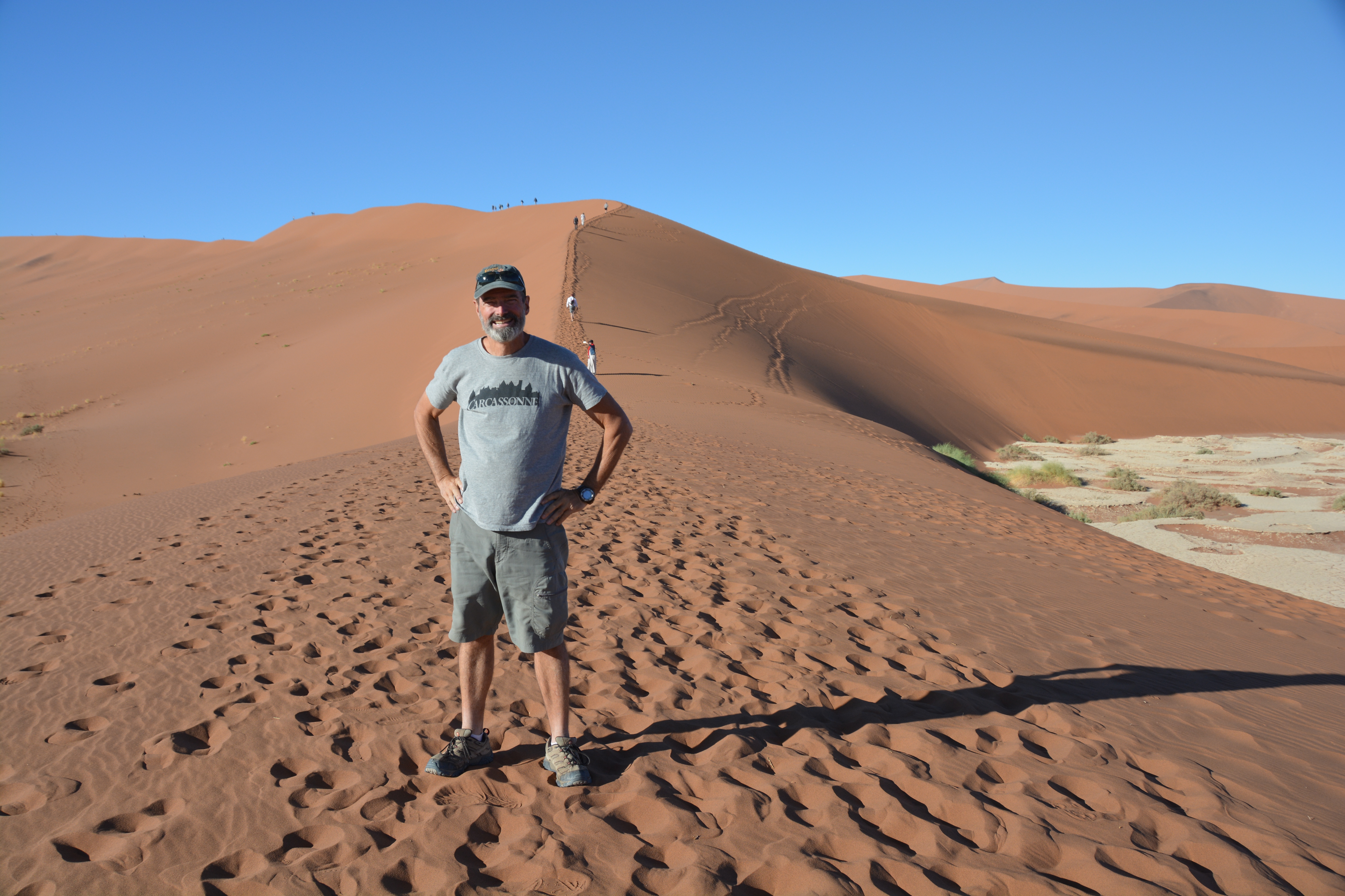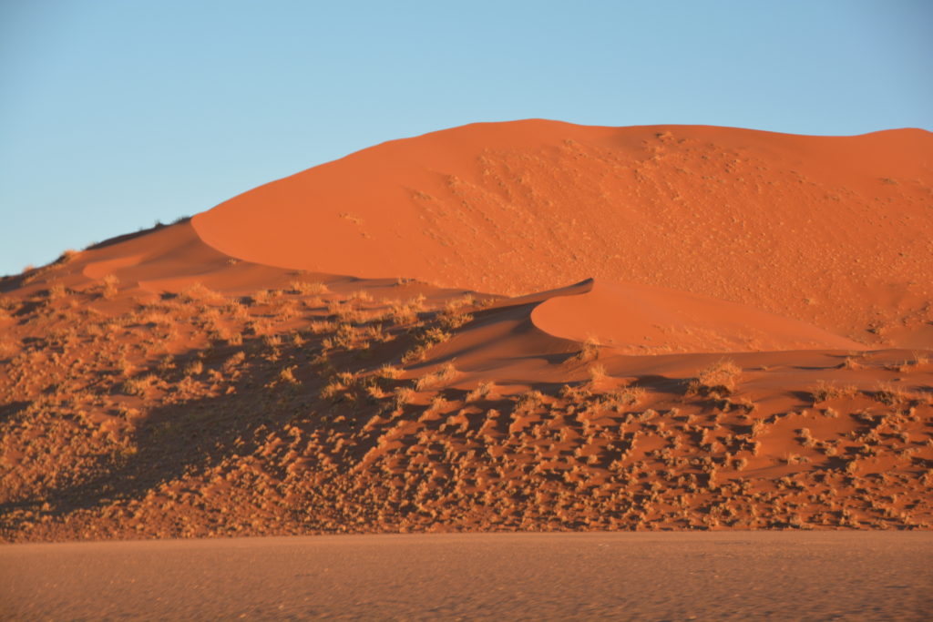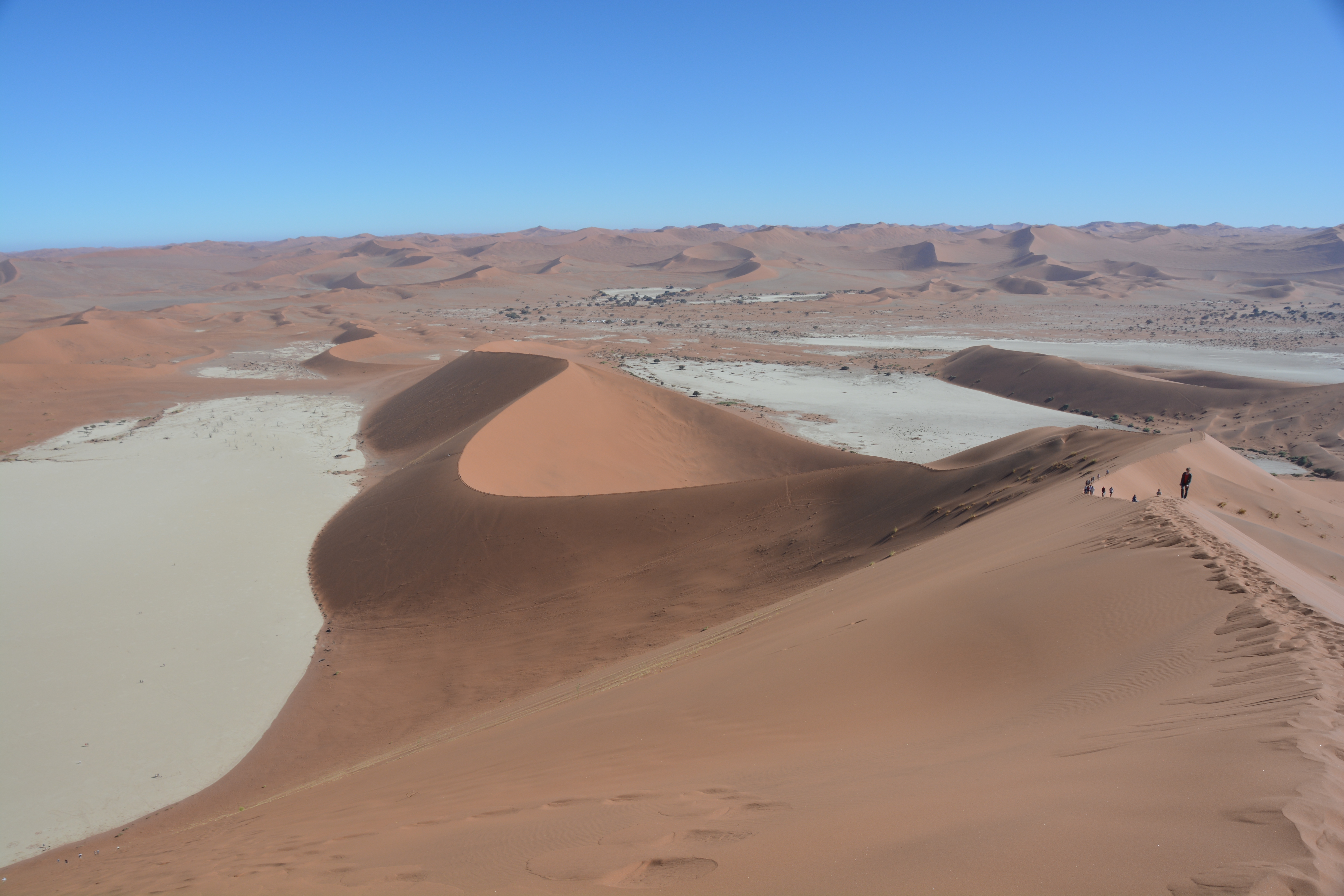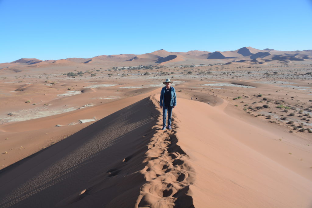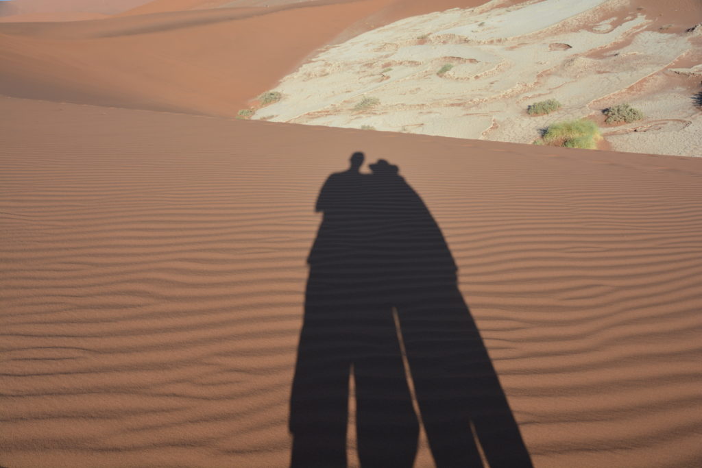 At the halfway saddle before a very steep section of the ridge Julie chose to take in the views from a sitting position while I continued the climb upward, huffing and puffing, until I eventually made the summit of Big Daddy. And from here it seemed I had the whole world in front of me, or at least Namibia, with sand dunes stretching as far as I could see, a stunning landscape available almost nowhere else in the world. I had made my Everest. The route down was direct – straight down the steep face of Big Daddy, part skiing, part sliding, part holding on for dear life, above my ankles in sand on every footstep until I made the salt pan of Deadvlei and rejoined Julie. Quite an experience, to say the least.