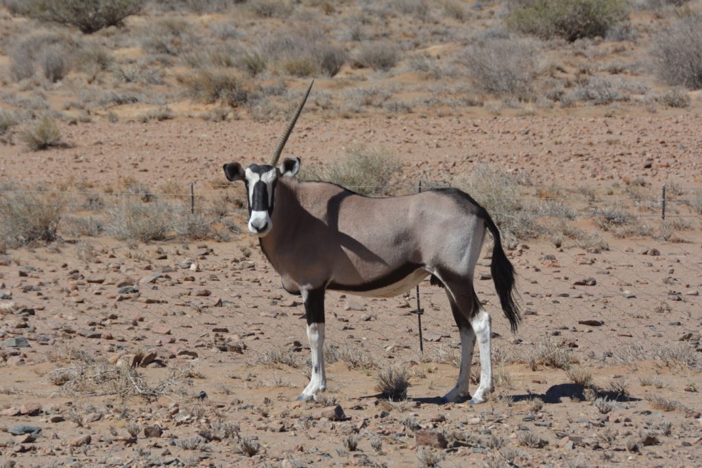 We’ve heard people say that driving across a desert is boring. They wouldn’t want to be in our car because we are talking about the desert all the time, its landscape, its texture and moods, its colours, its flora and fauna. We camped the first night behind a huge sandstone rock that rose out of the flat lifeless desert and the next morning spotted zebras, gemsboks, springboks and ostriches roaming across the sandy terrain. They may have been lonely but they were definitely not boring.