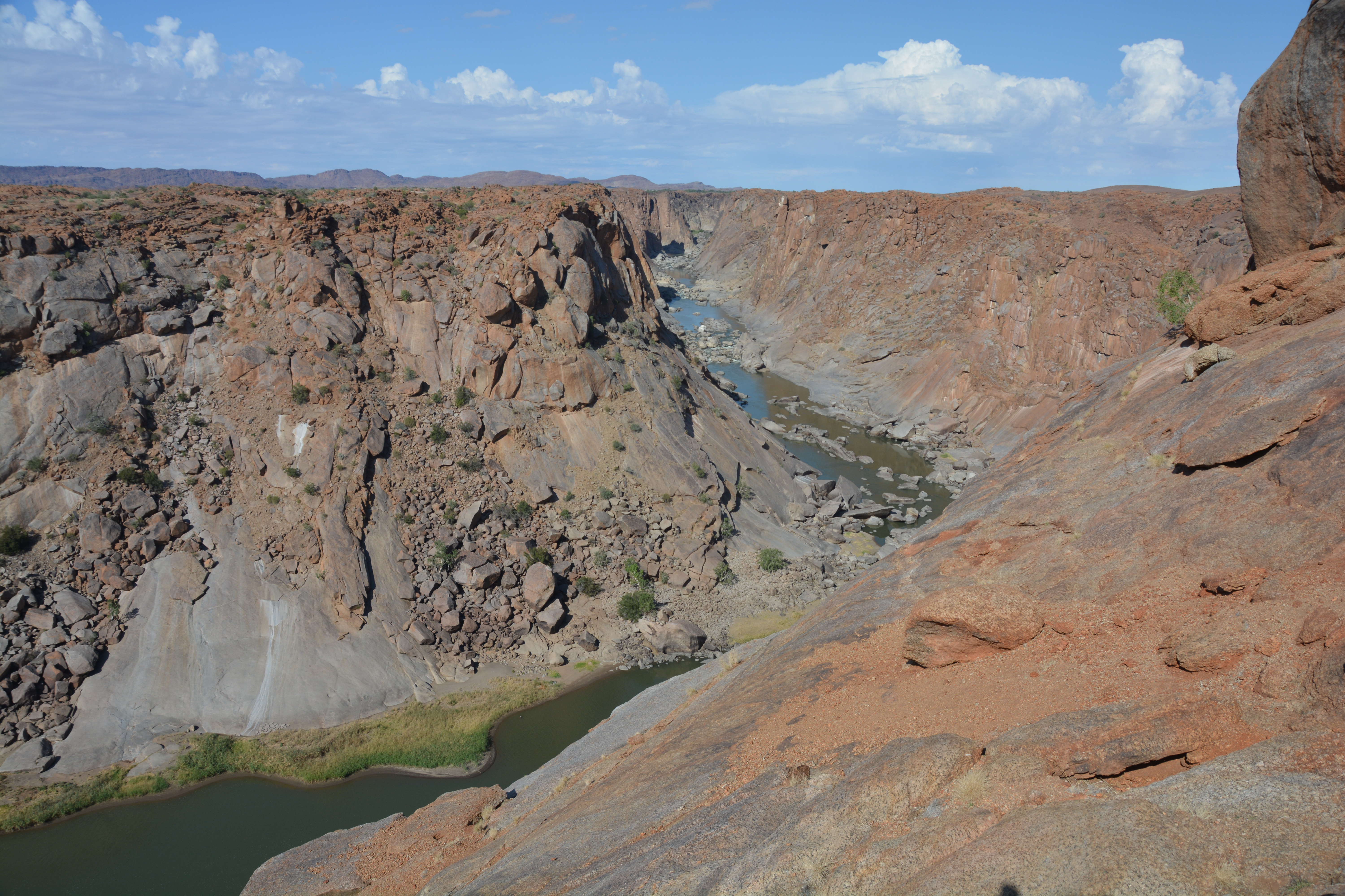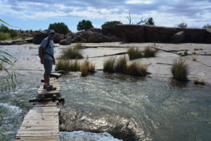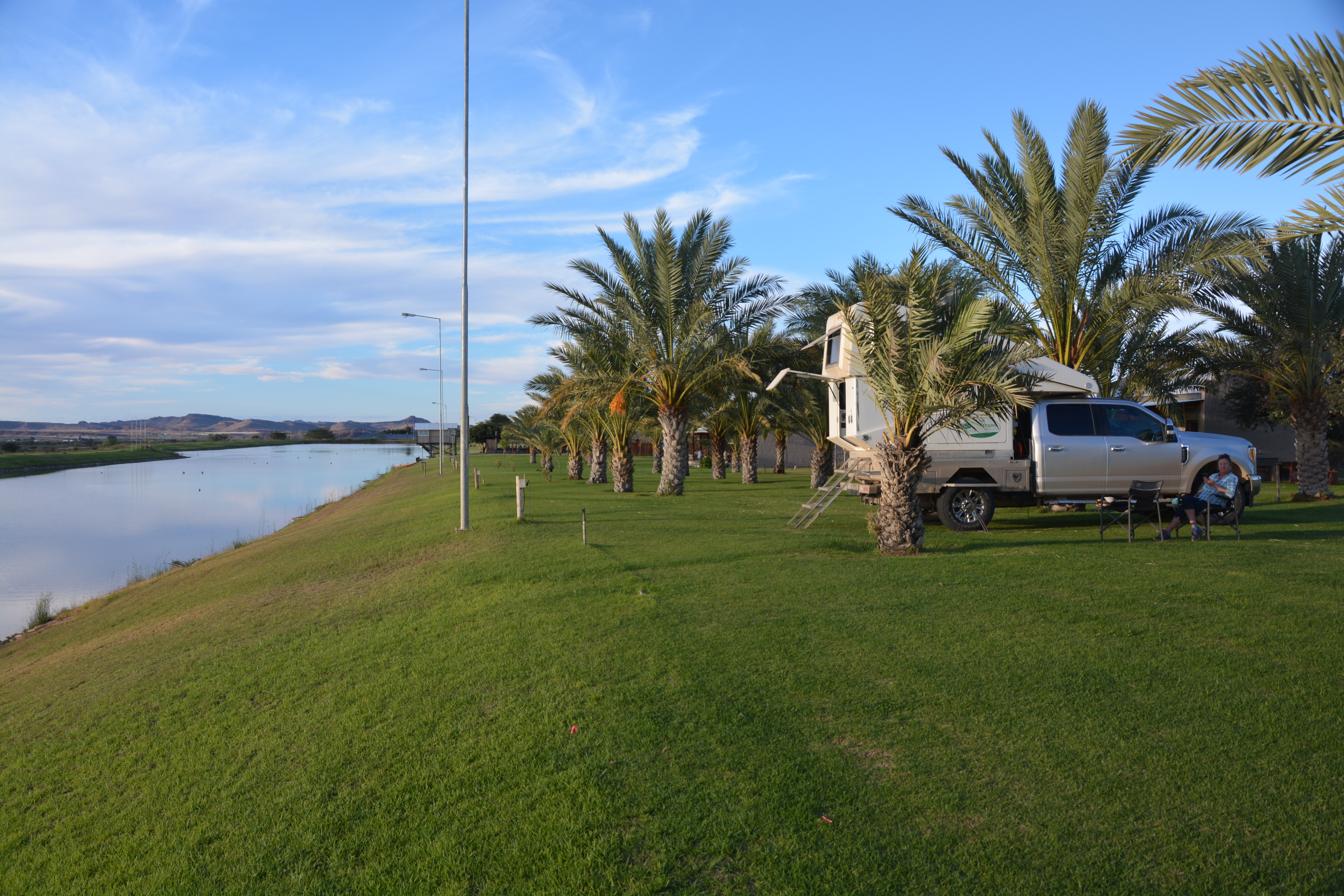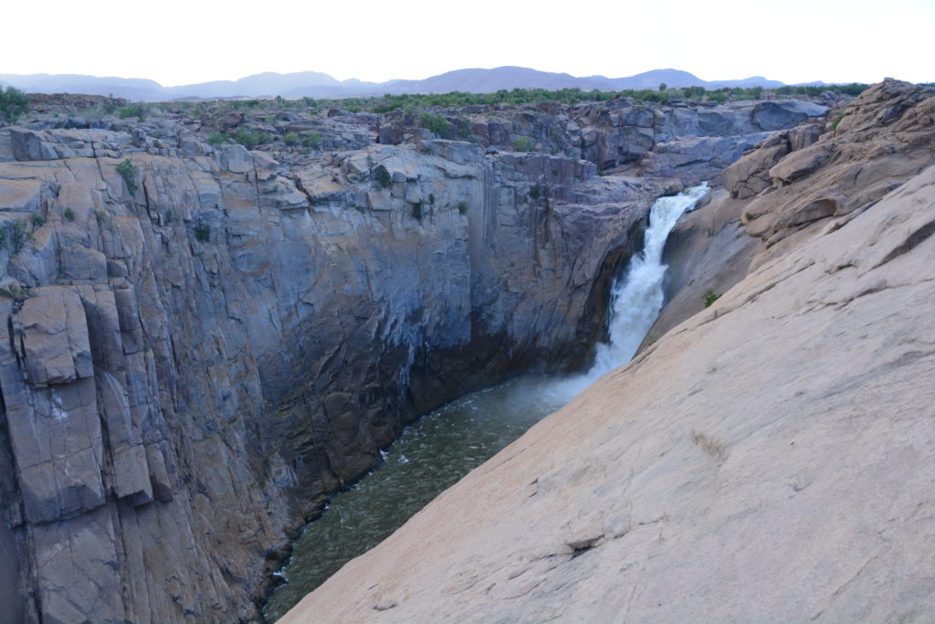 We camped our first night back in South Africa on a lake near Augrabie Falls National Park, the glowing sunset painting a beautiful 180-degree canvas of pinks, oranges and purples in our sky. To get there we passed through the substantial town of Upington which sits on the impressive Orange River. We followed the river to the national park, its banks lined with vineyards and orchards nurtured by irrigation from the river. We hadn’t seen this much green for a couple of months and enjoyed the new colours. And camping on grass instead of the persistent sand was a special treat!