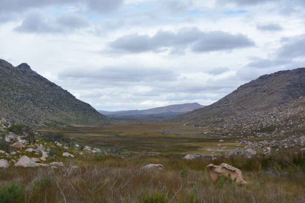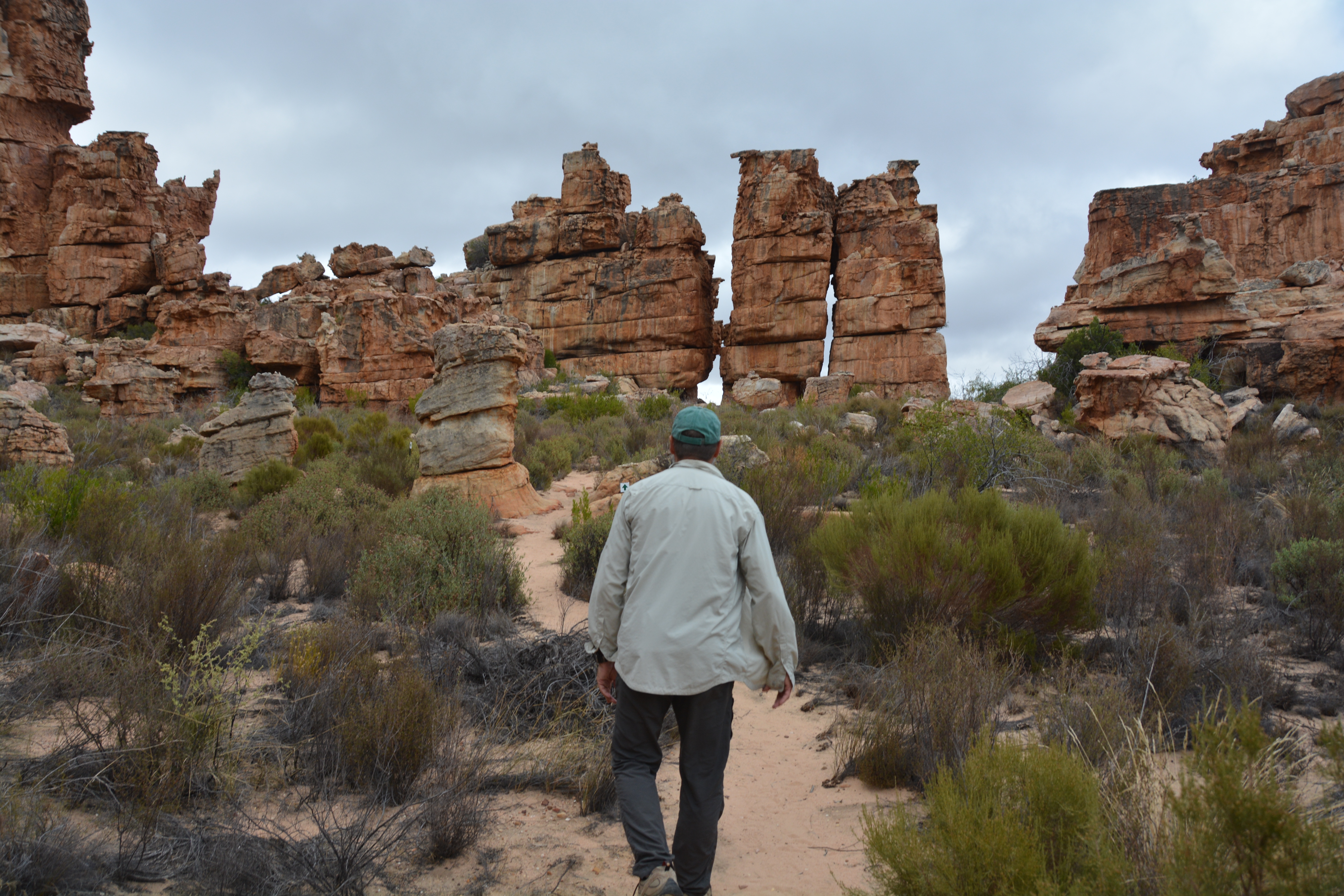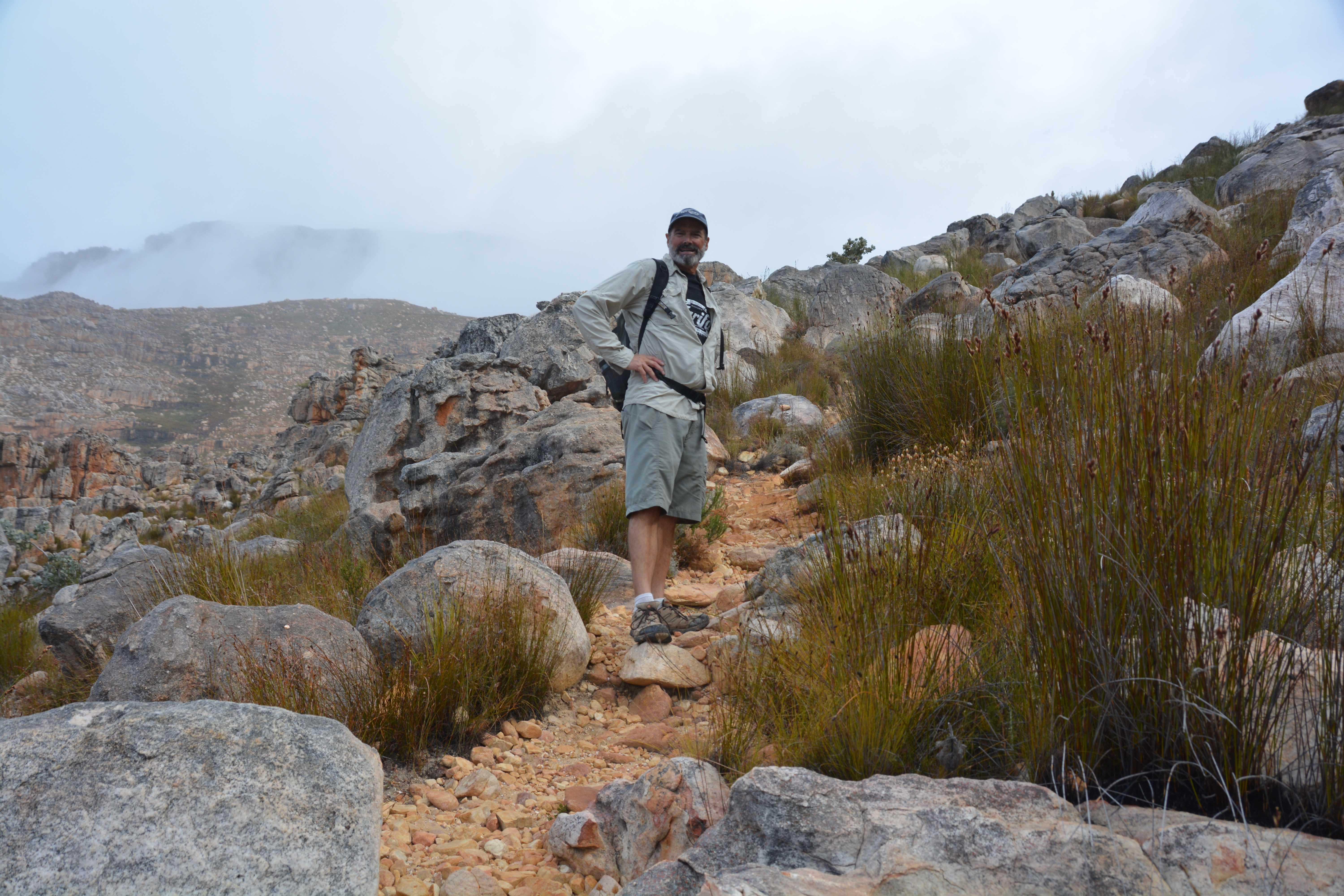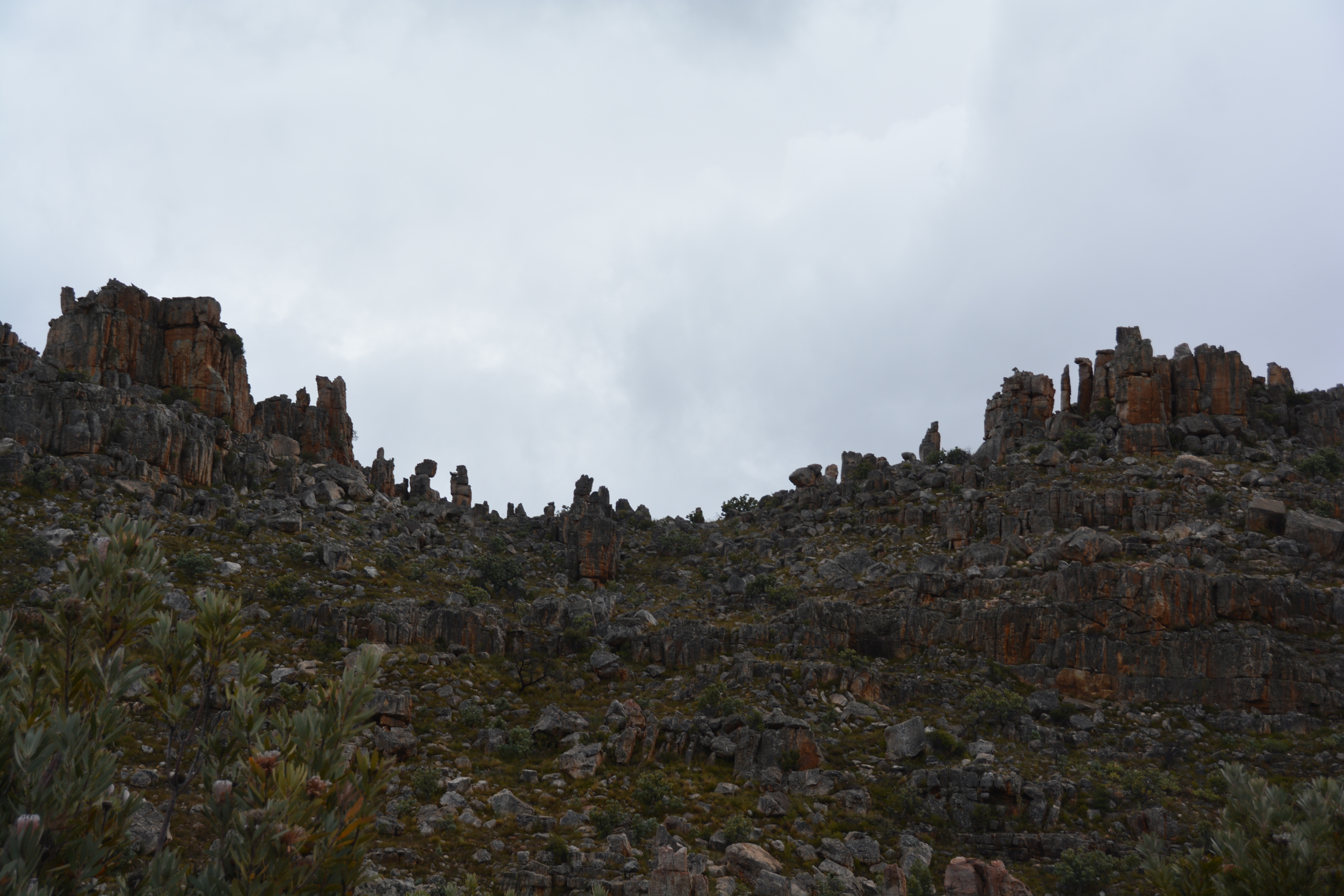 Here the rock formations defied description and the laws of gravity. Ancient rocks piled on each other, tall pillars still standing, rows of rocks like soldiers standing guard. An imaginative child couldn’t have drawn it better. We made our way to the trailhead for a popular walk up to what is called the Maltese Cross and followed the trail up a steep mountain face through more rocky surprises and old gnarly protea trees. But eventually the cold wind and drizzly rain forced an early turnaround point and we headed back down to dryer ground.