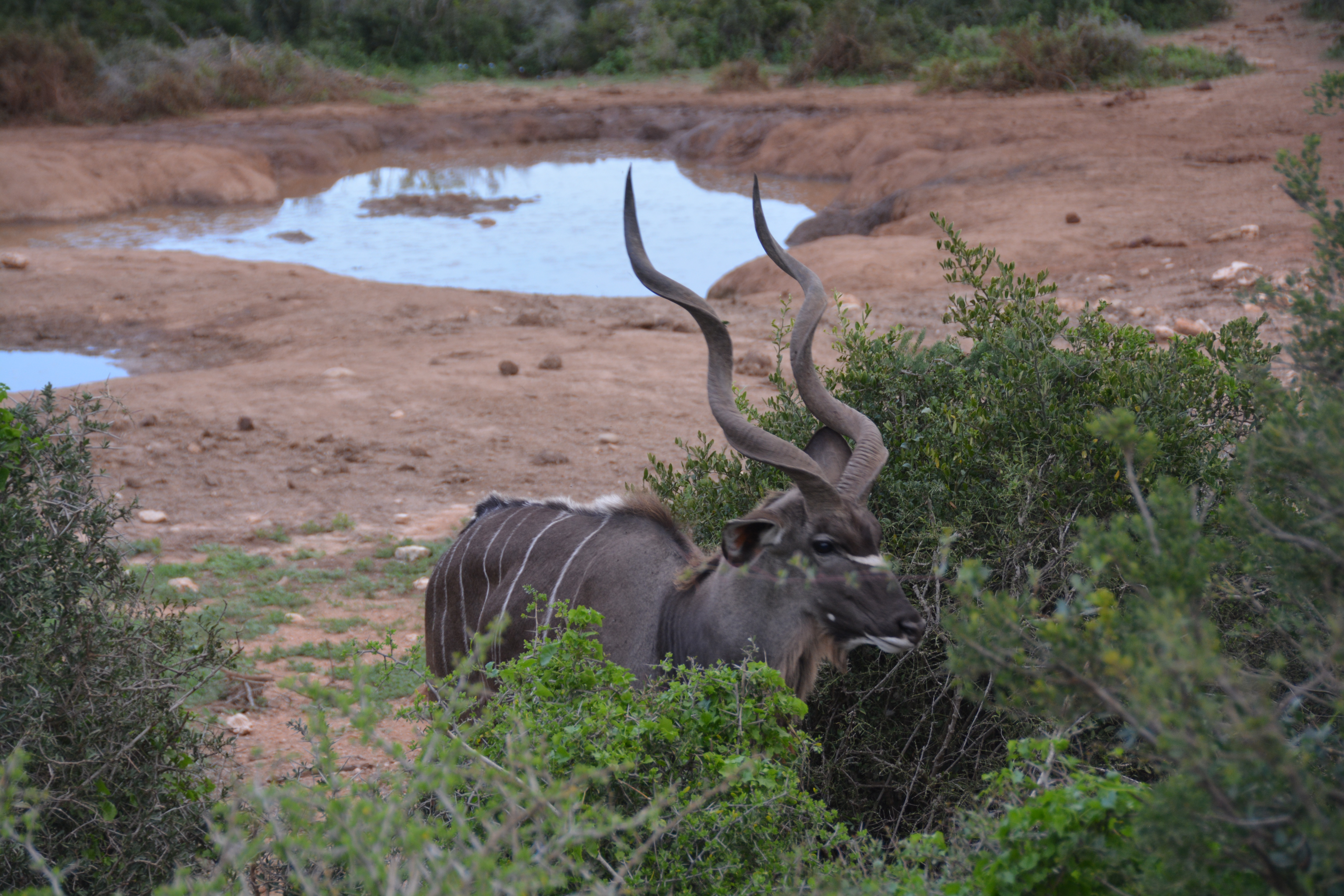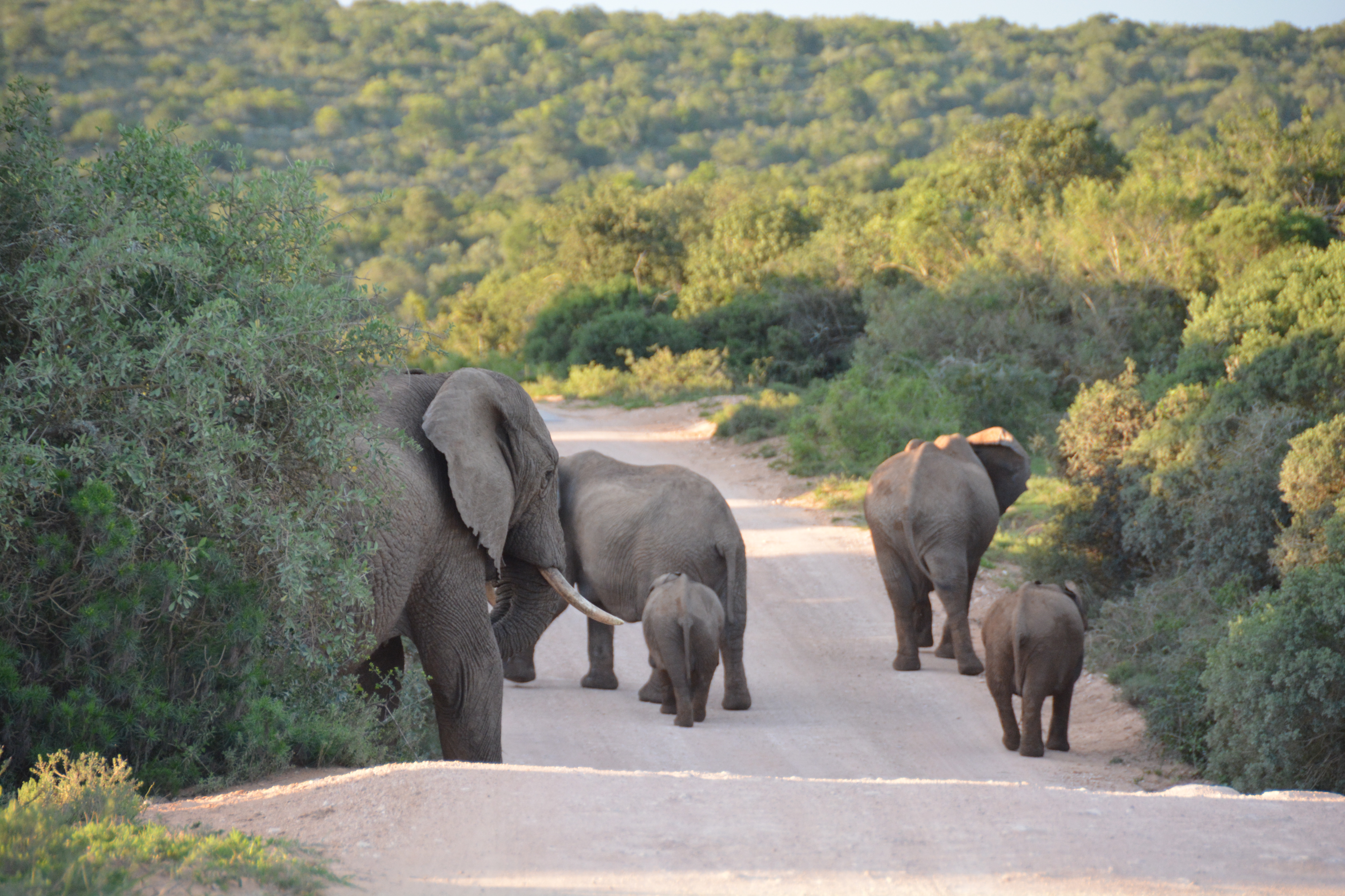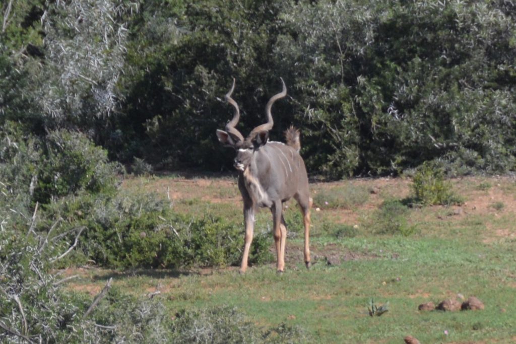 Addo may be famous for its elephants, and we saw some before we had even crossed through the gate, but it also featured many herds of kudus, one of our favourite animals because of their distinctive colours and the magnificent horns the males carry around. Our afternoon game drive saw us cover a good chunk of the park and take in many of our old favourites, including a large family of elephants who were grazing from the road in front of us.