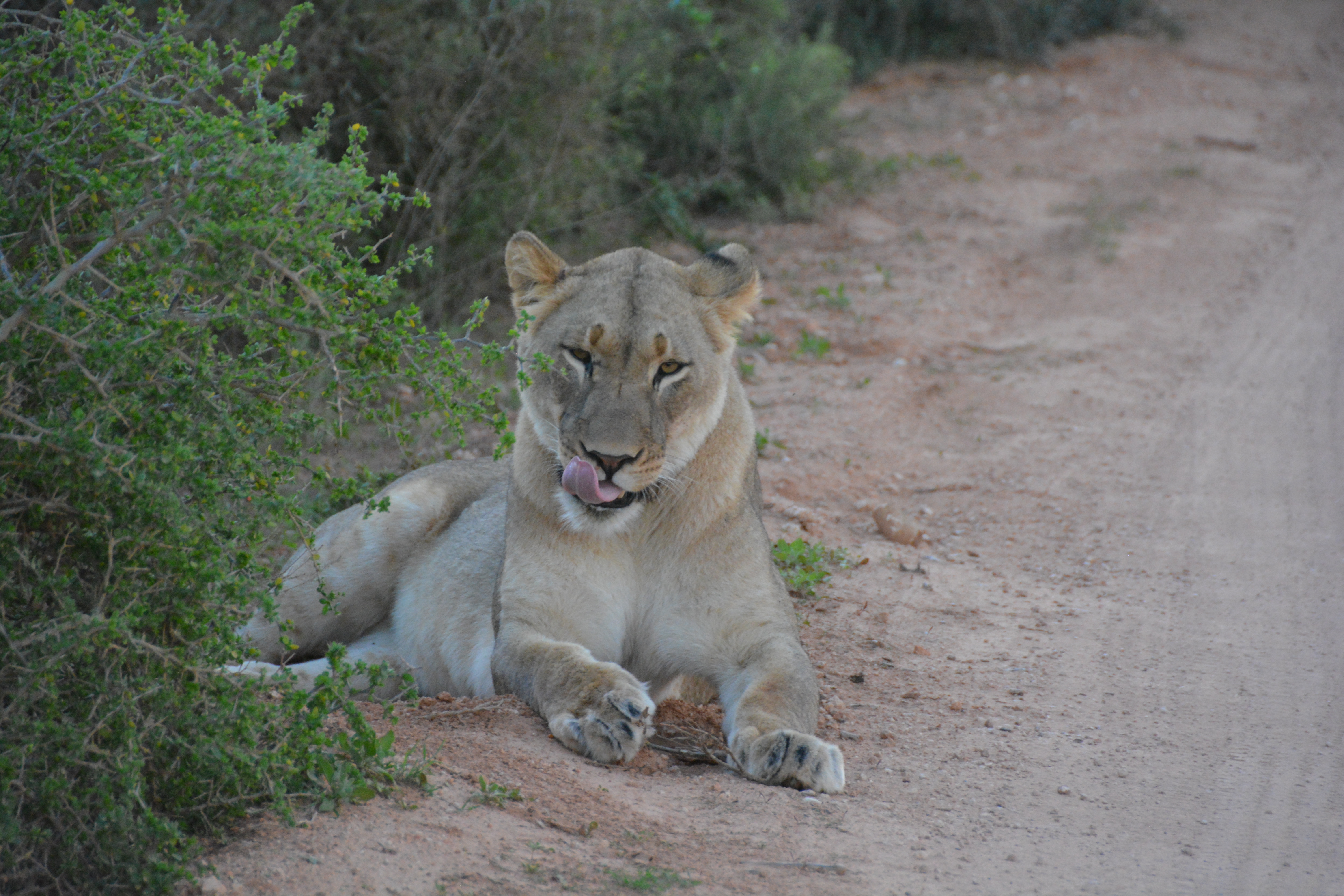 But the highlight of the afternoon was coming across a beautiful lioness stalking a large male kudu which bellowed out some loud warnings before disappearing into the bush. Having given up on the kudu as her dinner the lion decided to plonk herself down on the edge of the road right in front of Tramp. What a special experience – Africa in all its rage and glory.