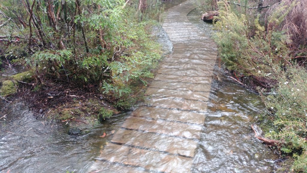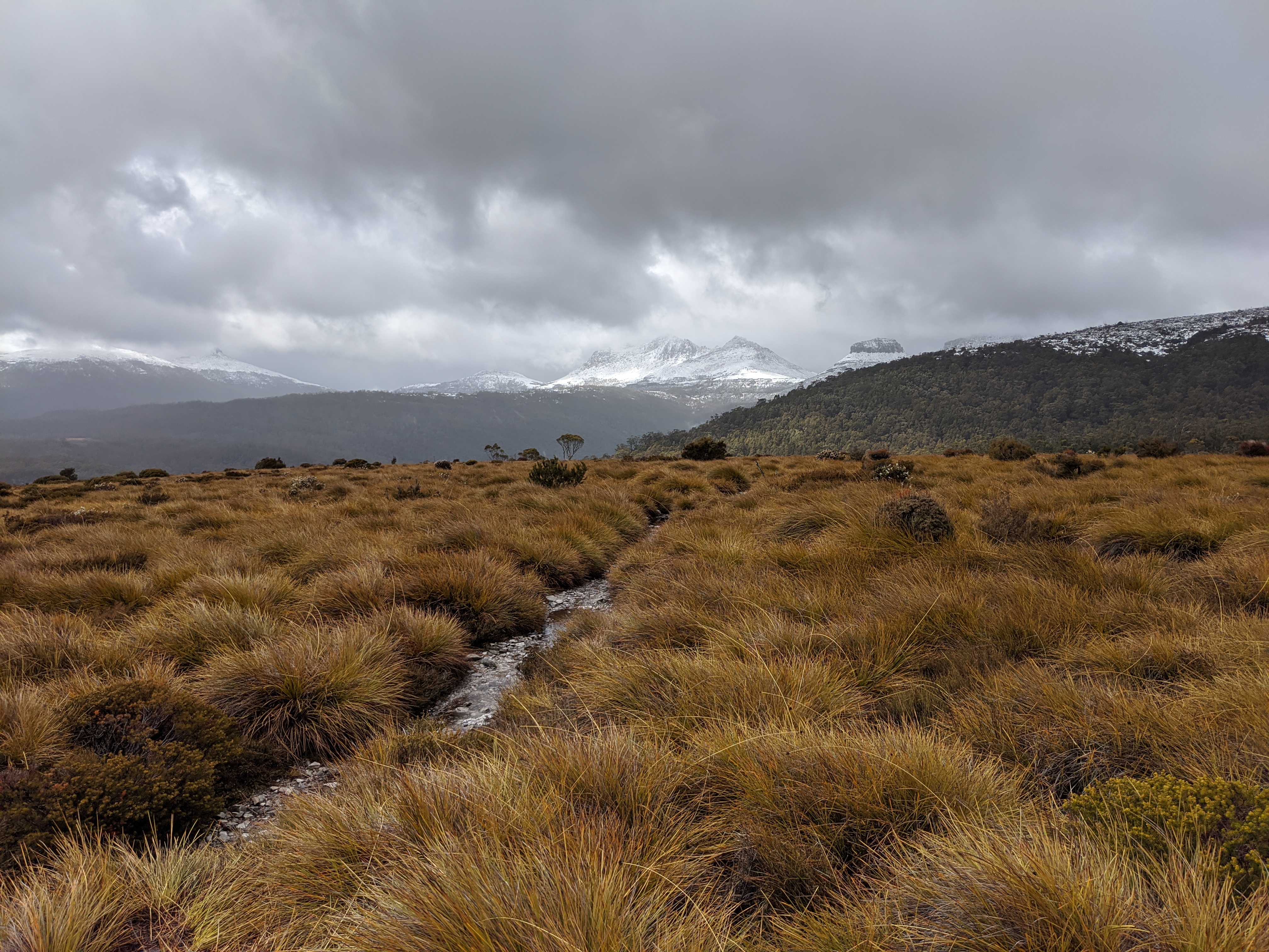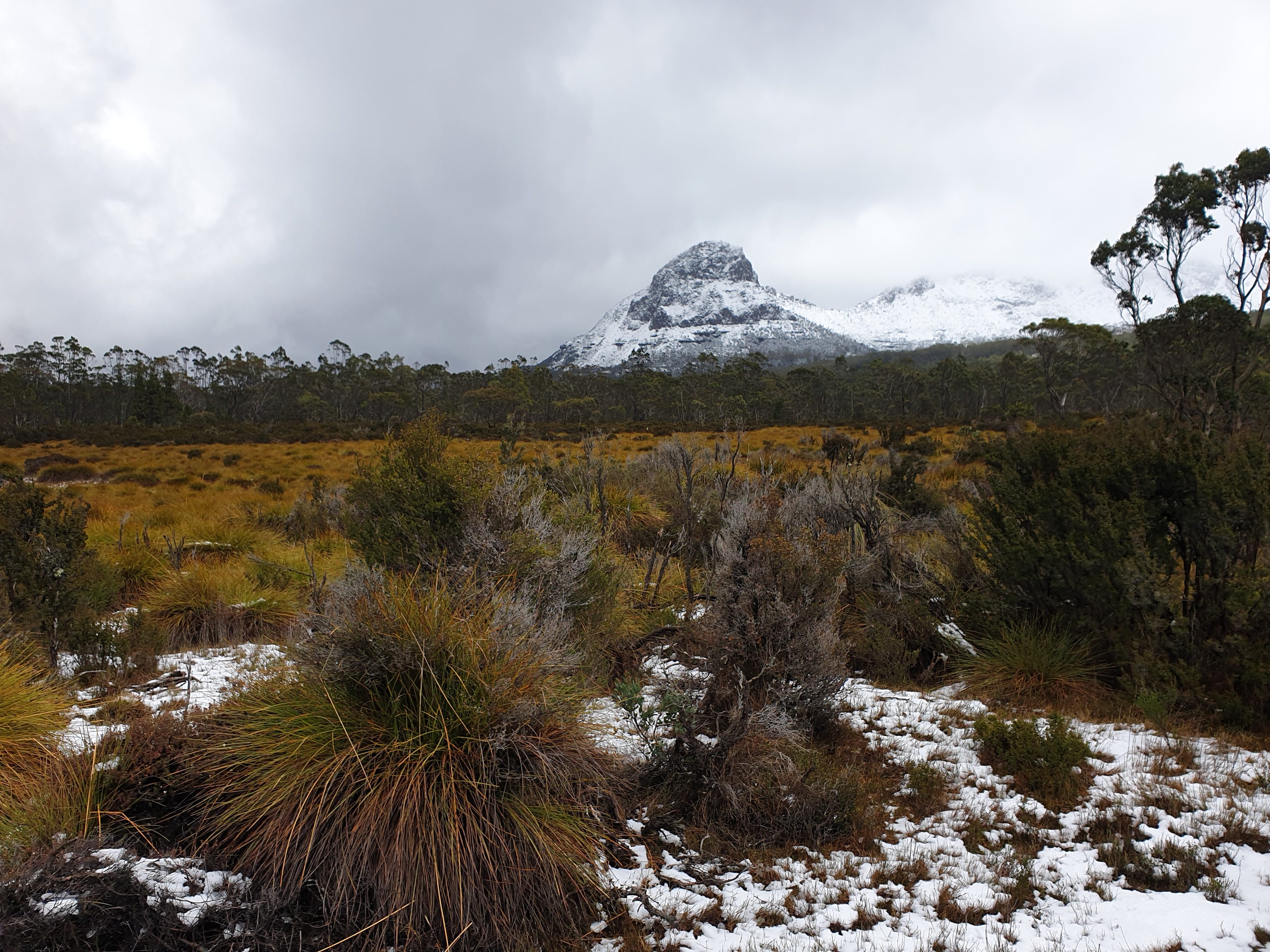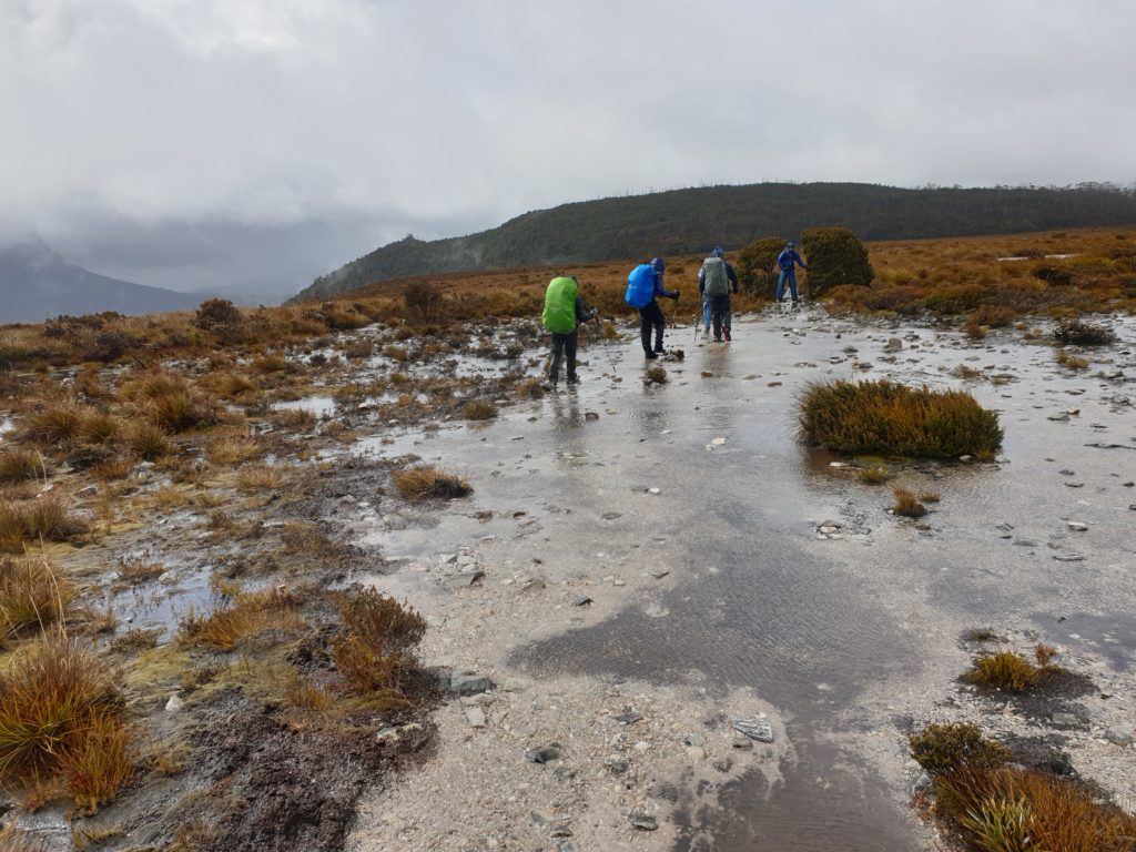 Considering the evil forecast for the day Anna and Sheena wisely chose to join us again and so our team of six headed off on the trail in the cold, drizzly, slushy weather. For most of the morning we crossed open moors and grasslands with the trail just a long series of deep black muddy areas between large unavoidable flooded areas. The trail left quite a deep and permanent scar across these beautiful open plains with little effort to avoid the damage. I had already started coming to the conclusion that Tasmania National Parks were not heavily focused on track maintenance for the sake of the walkers or the environment. They either wanted walkers to experience the rawness of nature or they were underfunded for such projects. Either way, it was a cold, soggy and muddy morning.