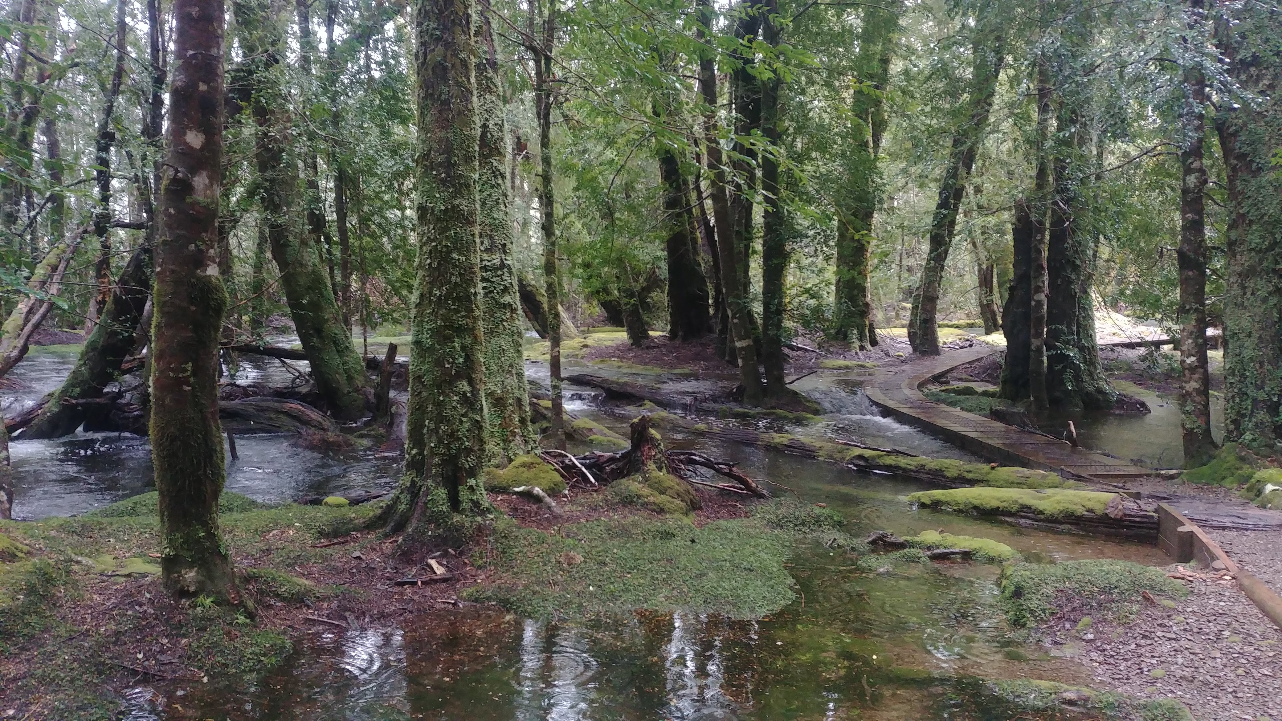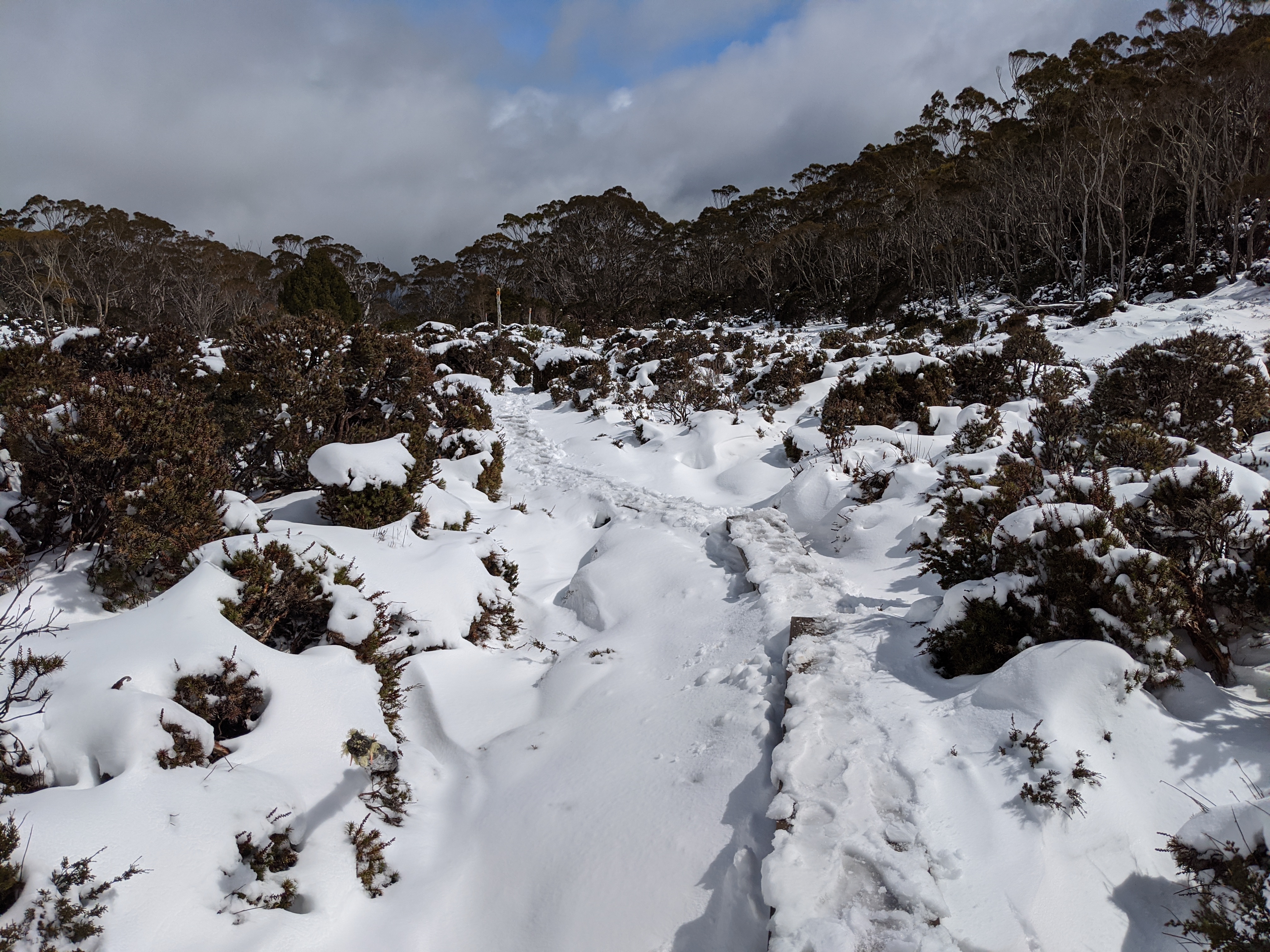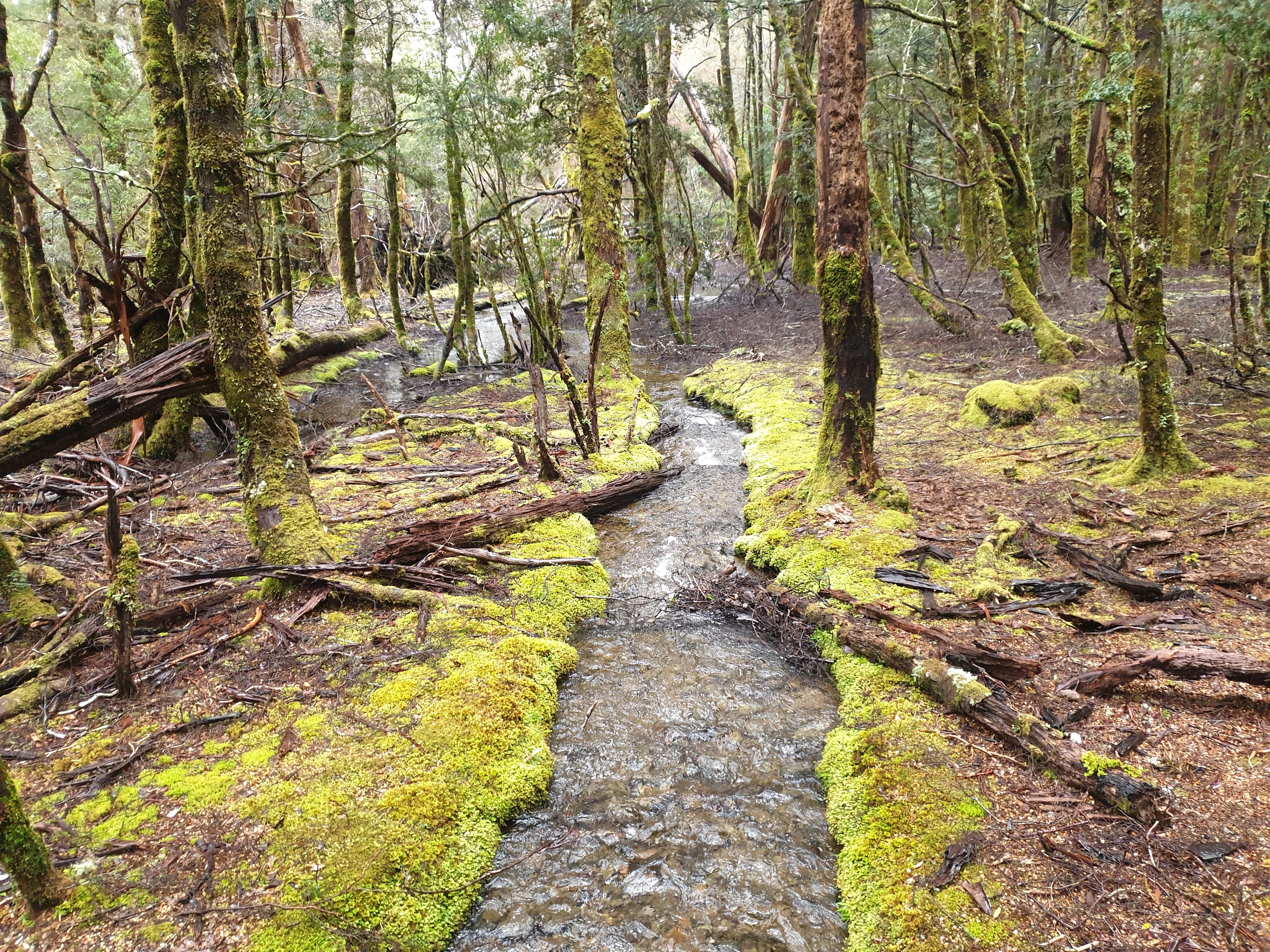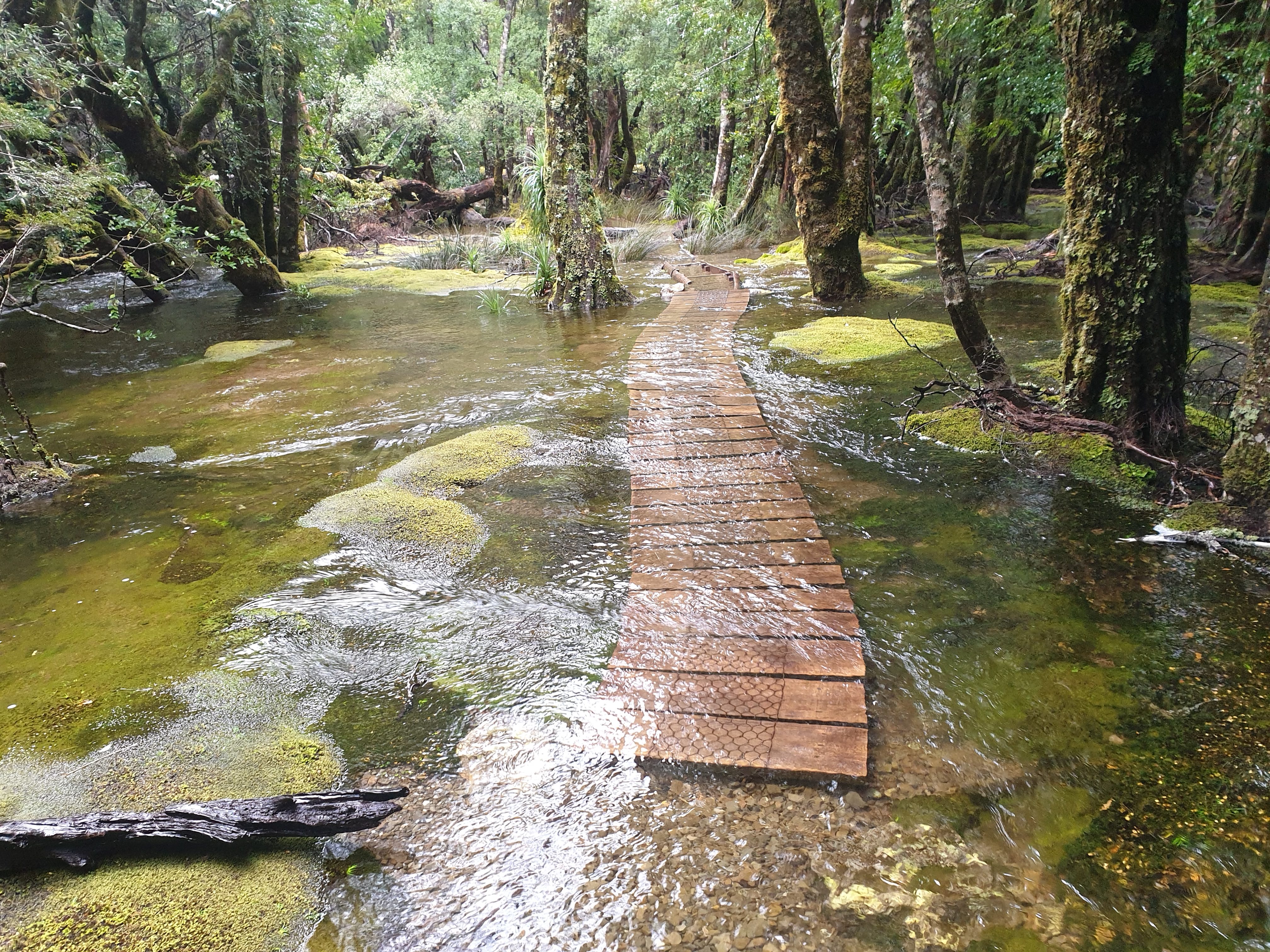 Considering the evil forecast for the day Anna and Sheena wisely chose to join us again and so our team of six headed off on the trail in the cold, drizzly, slushy weather. For most of the morning we crossed open moors and grasslands with the trail just a long series of deep black muddy areas between large unavoidable flooded areas. The trail left quite a deep and permanent scar across these beautiful open plains with little effort to avoid the damage. I had already started coming to the conclusion that Tasmania National Parks were not heavily focused on track maintenance for the sake of the walkers or the environment. They either wanted walkers to experience the rawness of nature or they were underfunded for such projects. Either way, it was a cold, soggy and muddy morning.