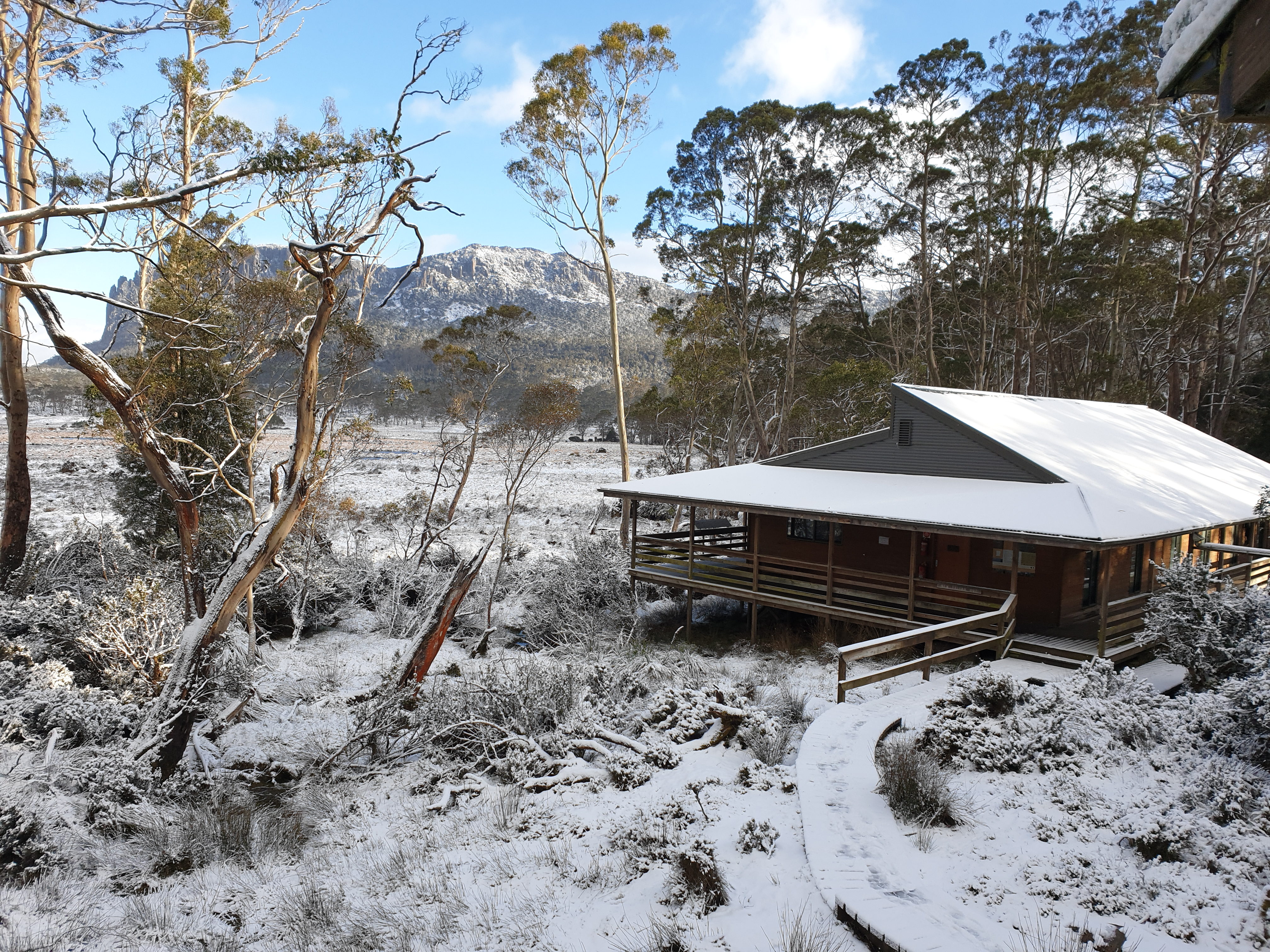 Pelion Hut the next morning – very pretty with a fresh layer of snow and look at the beautiful blue skies! (it didn’t last)