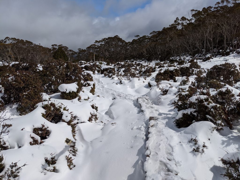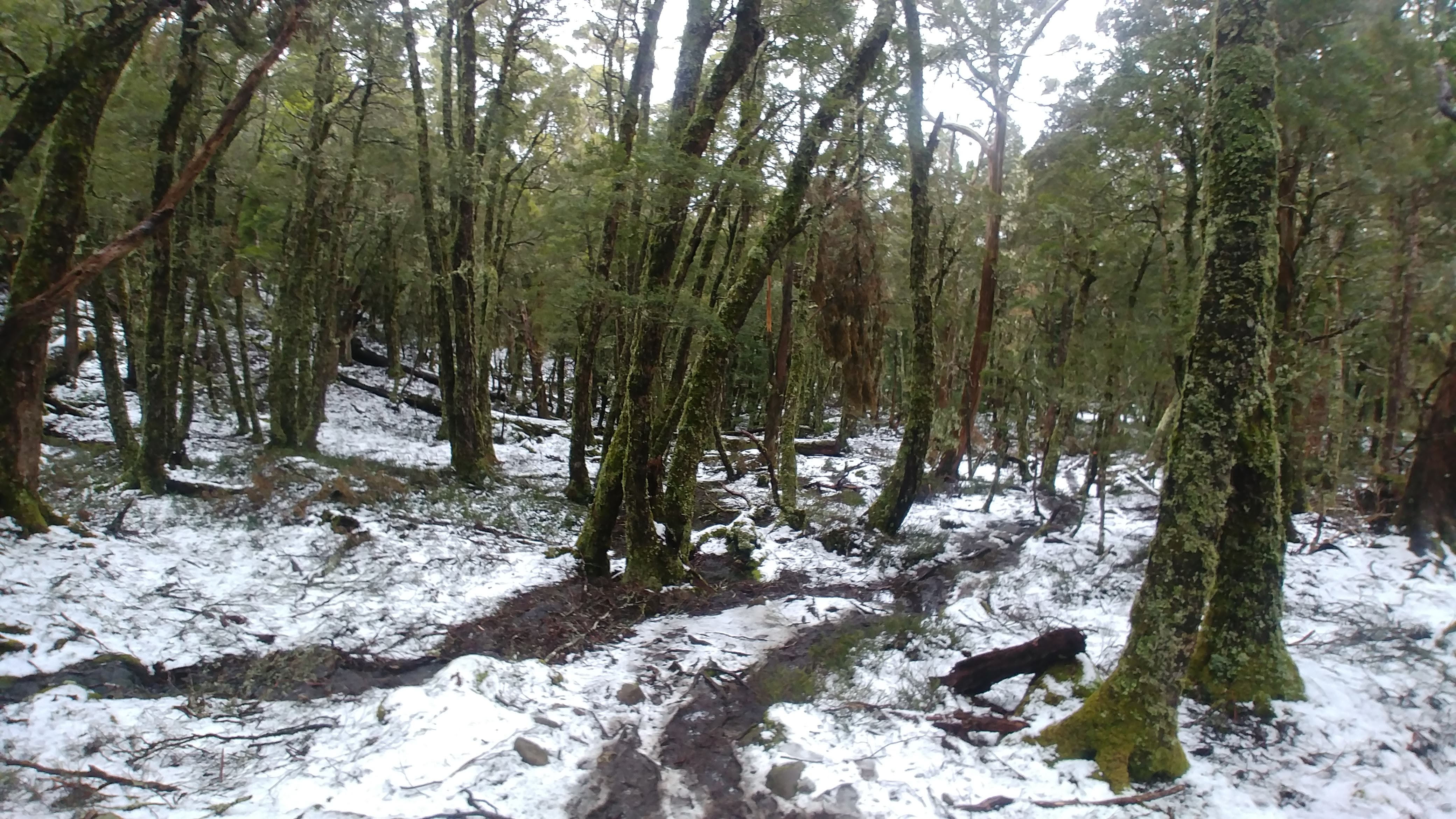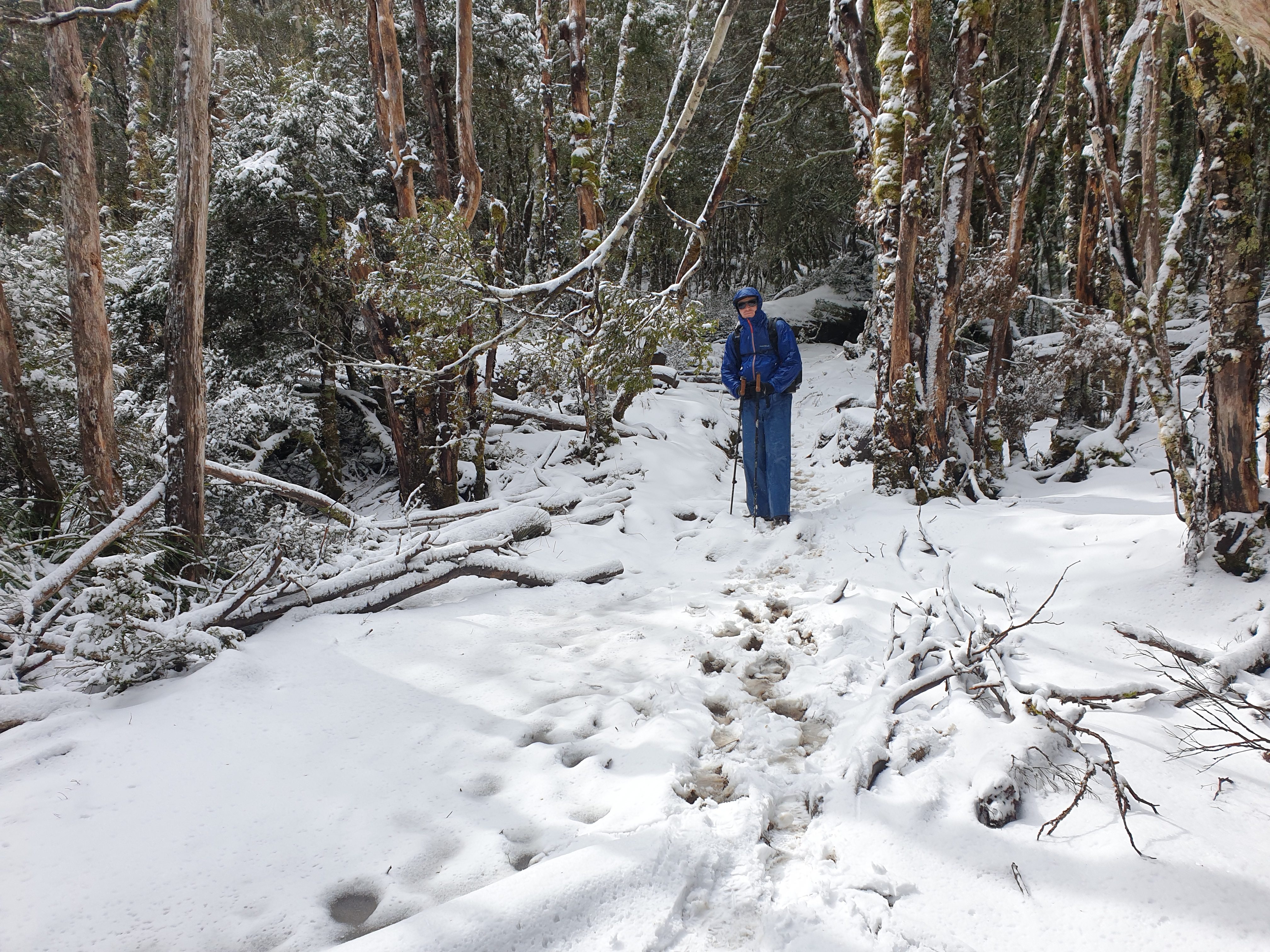 The promise of better weather the next day proved a false promise but we did wake to a beautiful blanket of thick fresh snow across the valley and covering all the trees. Having abandoned our vague plans to climb a few of the nearby peaks our new plan was to ‘double hut’ which means to walk past one hut and stay the night at the next hut called Windy Ridge, a walk of about 17 kilometres. We also knew this day involved climbing up and over two high gaps which promised more bad weather.