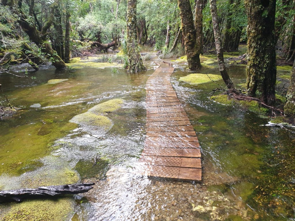 On Day Five our plan was to take the detour trail off to beautiful Pine Valley so we could explore some of the treasures this area had to offer and sleep in the modest Pine Valley Hut that night. So the next morning we changed from our set of dry clothes to our set of wet clothes again and trekked off into the cold rainy morning. And it was more of the same, cold, wet and muddy, a constantly flooded track, very slow going.