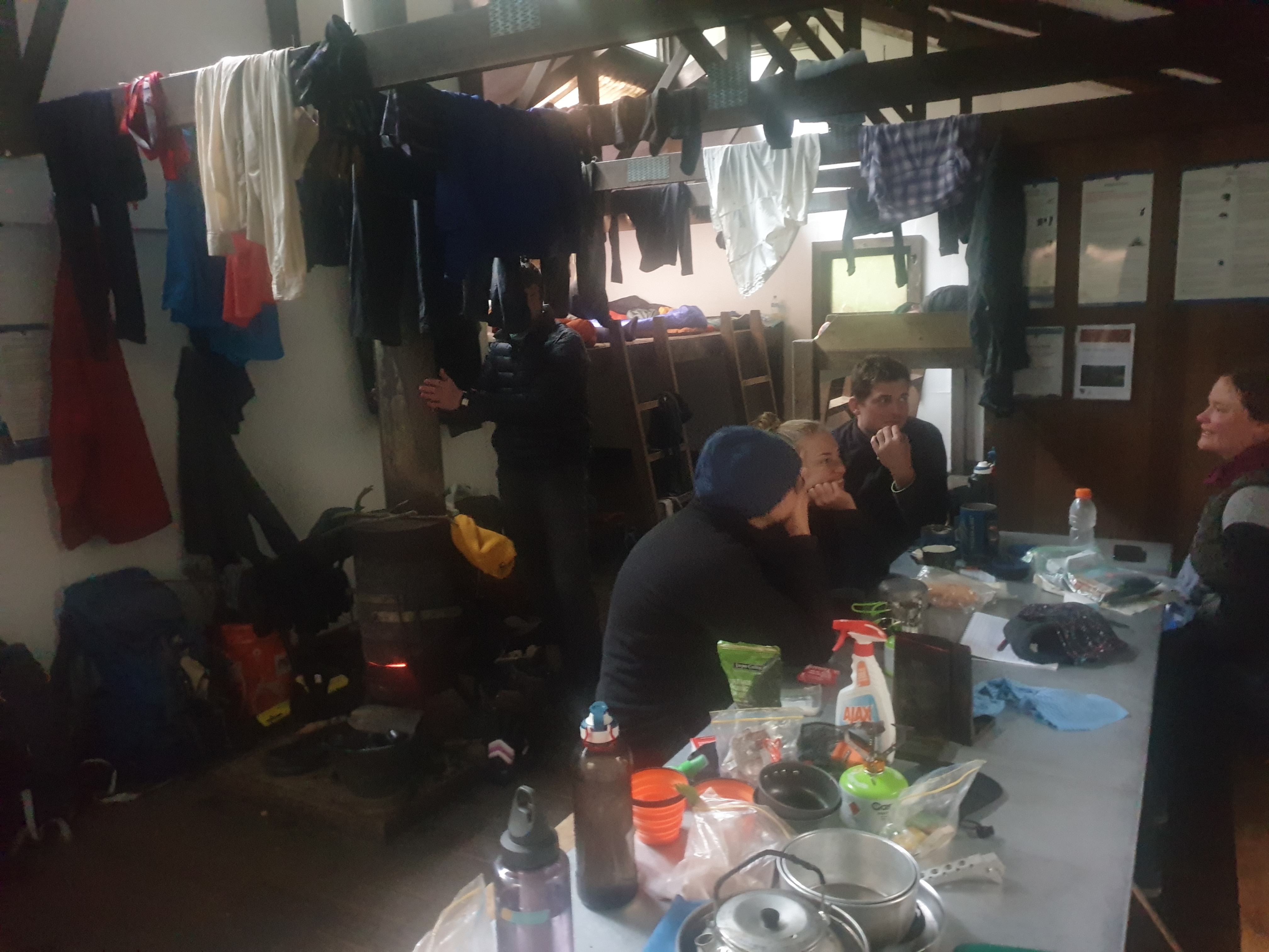 The Pine Valley Hut was the smallest and cosiest of the huts – here you can see Zach standing next to the coal fire heater while others are chatting at the table