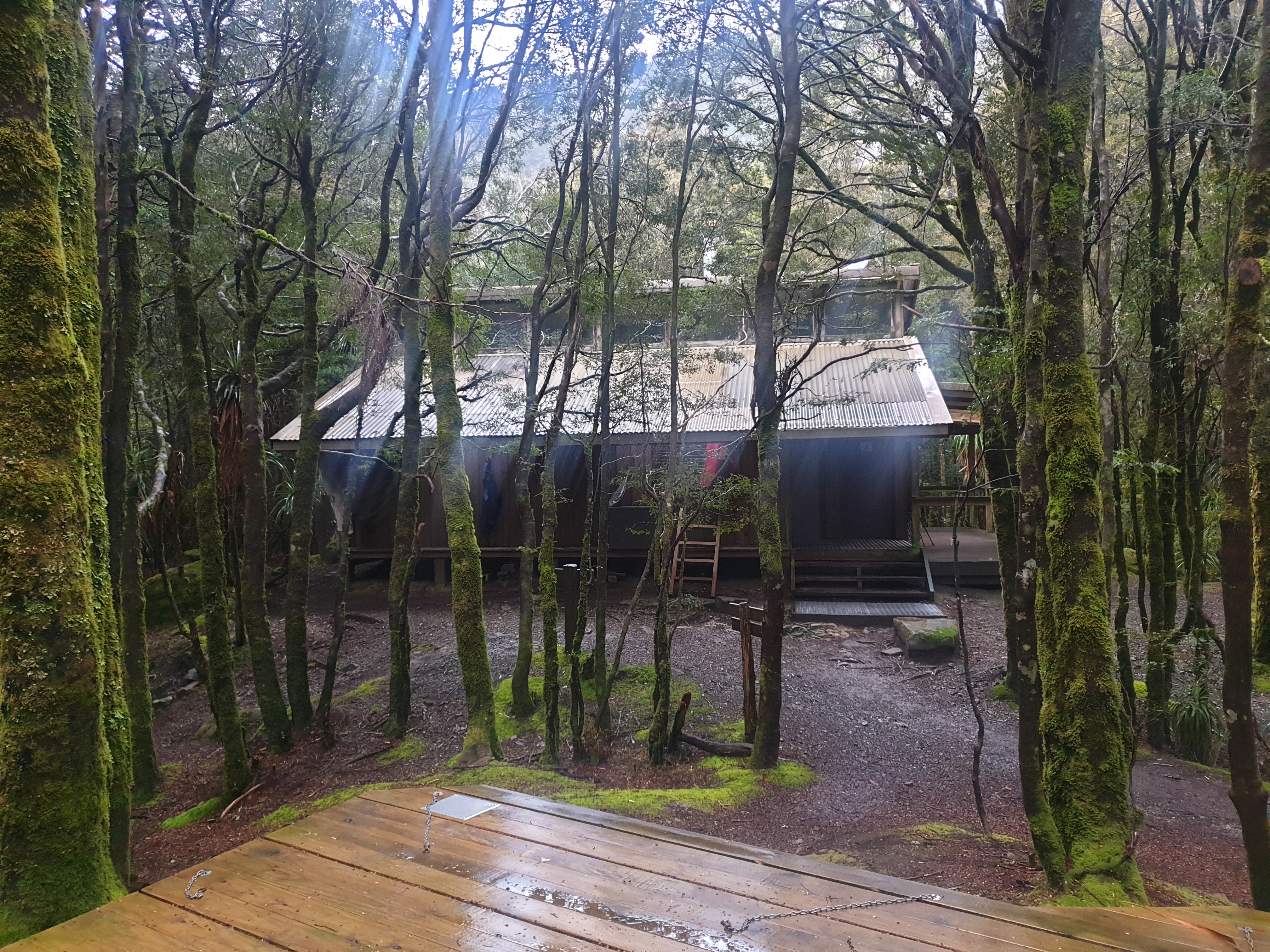 After another three hours of hard dreary walking through the mud, negotiating endless exposed tree roots, river streams and fallen trees we finally made it to Echo Point Hut. What we found shocked us – a very old hut with room for eight to sleep, no place to sit, no coal, full of cob webs and warnings on the walls of rats that invade each night. We were absolutely buggered beyond belief but we couldn’t stay here, no way. Miraculously Will got phone reception and booked us into the basic bunk bed backpackers accommodation at the lodge that night.