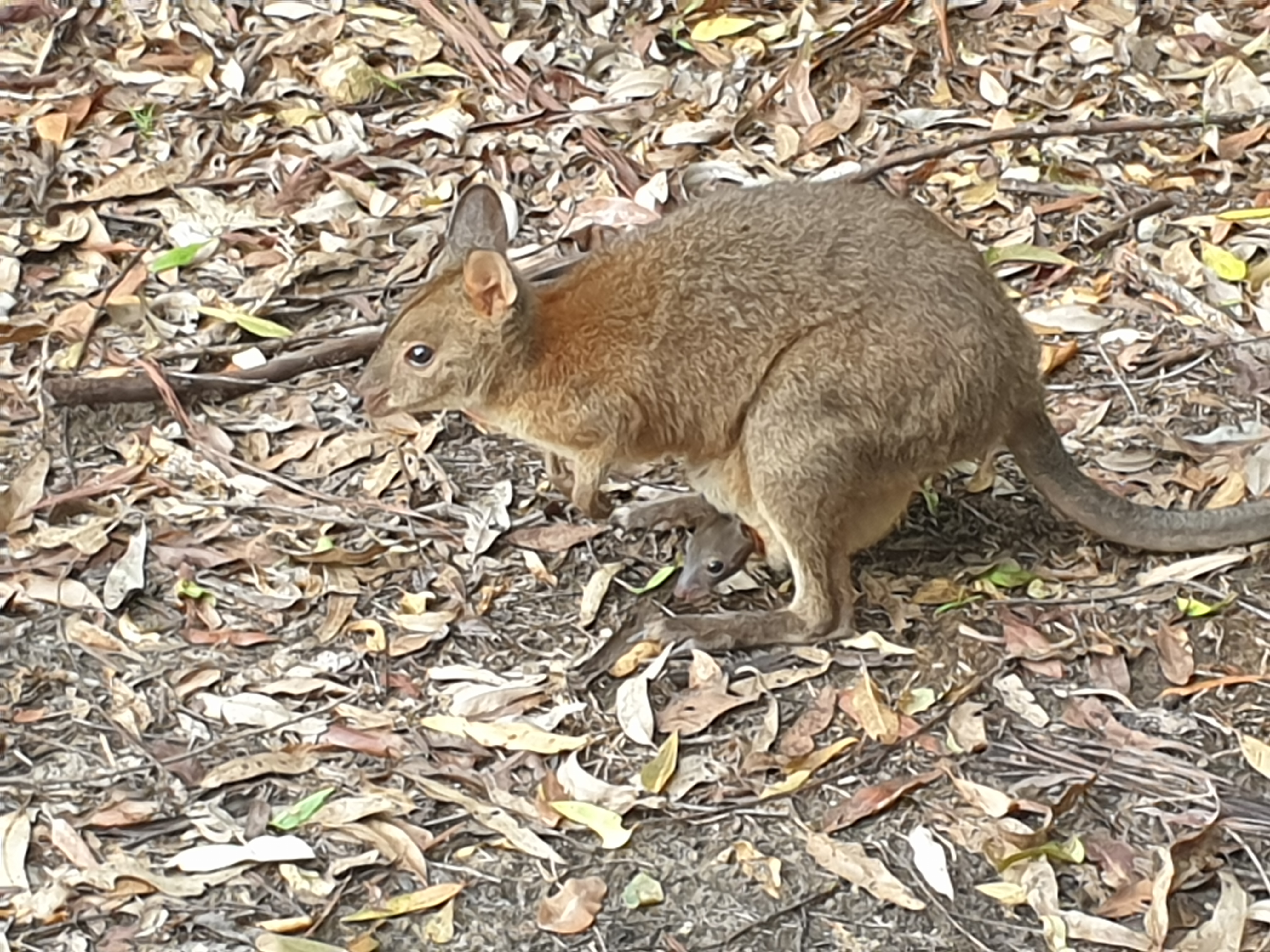 A pademelon comes into camp to sniff out a bit of free food – see the little joey sticking her head out of Mum’s pouch