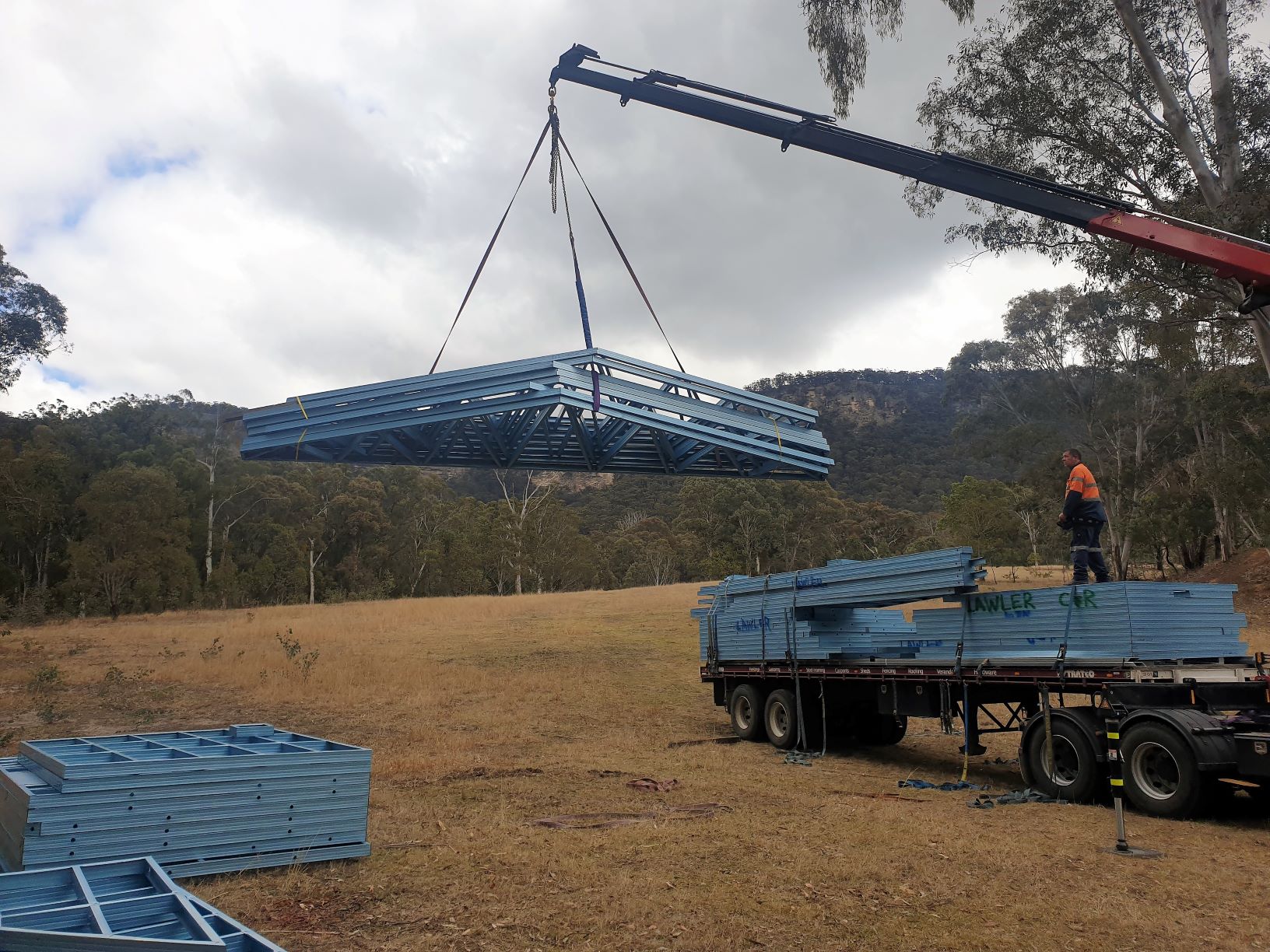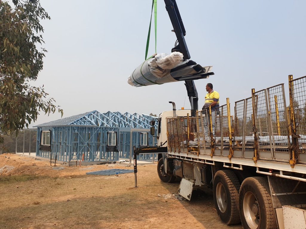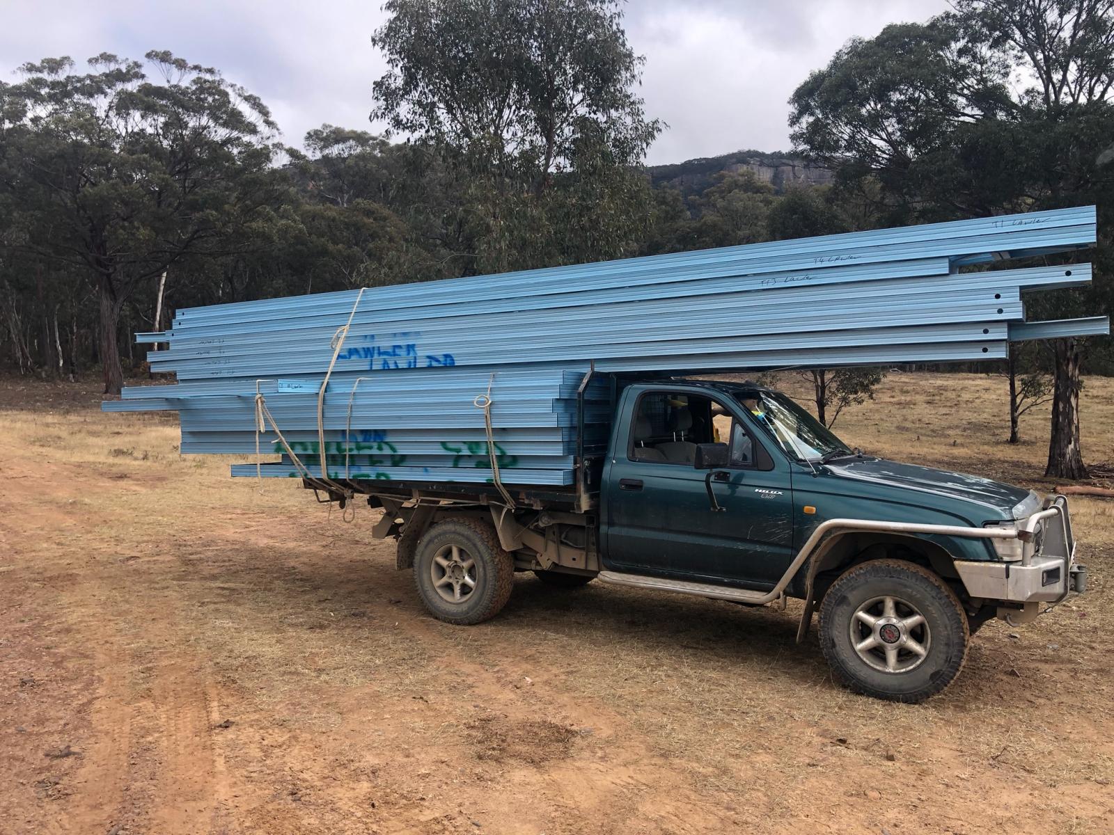 Ben our builder came to the rescue and had his three apprentices load the frames and trusses on the back of the ute – many trips later they moved all of them to the building site.
