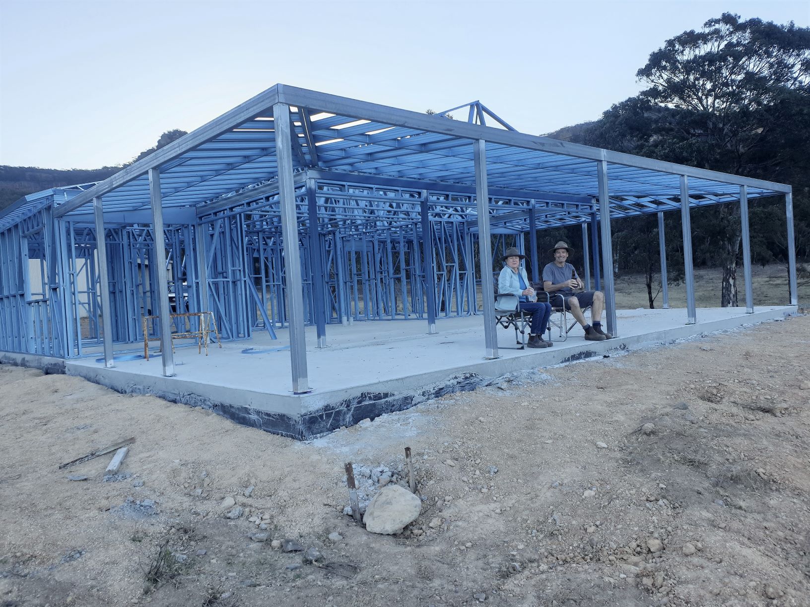 The frames and trusses eventually all went up despite some of them being badly bent in transit. Julie and I finally got to sit on our future veranda at cocktail hour.