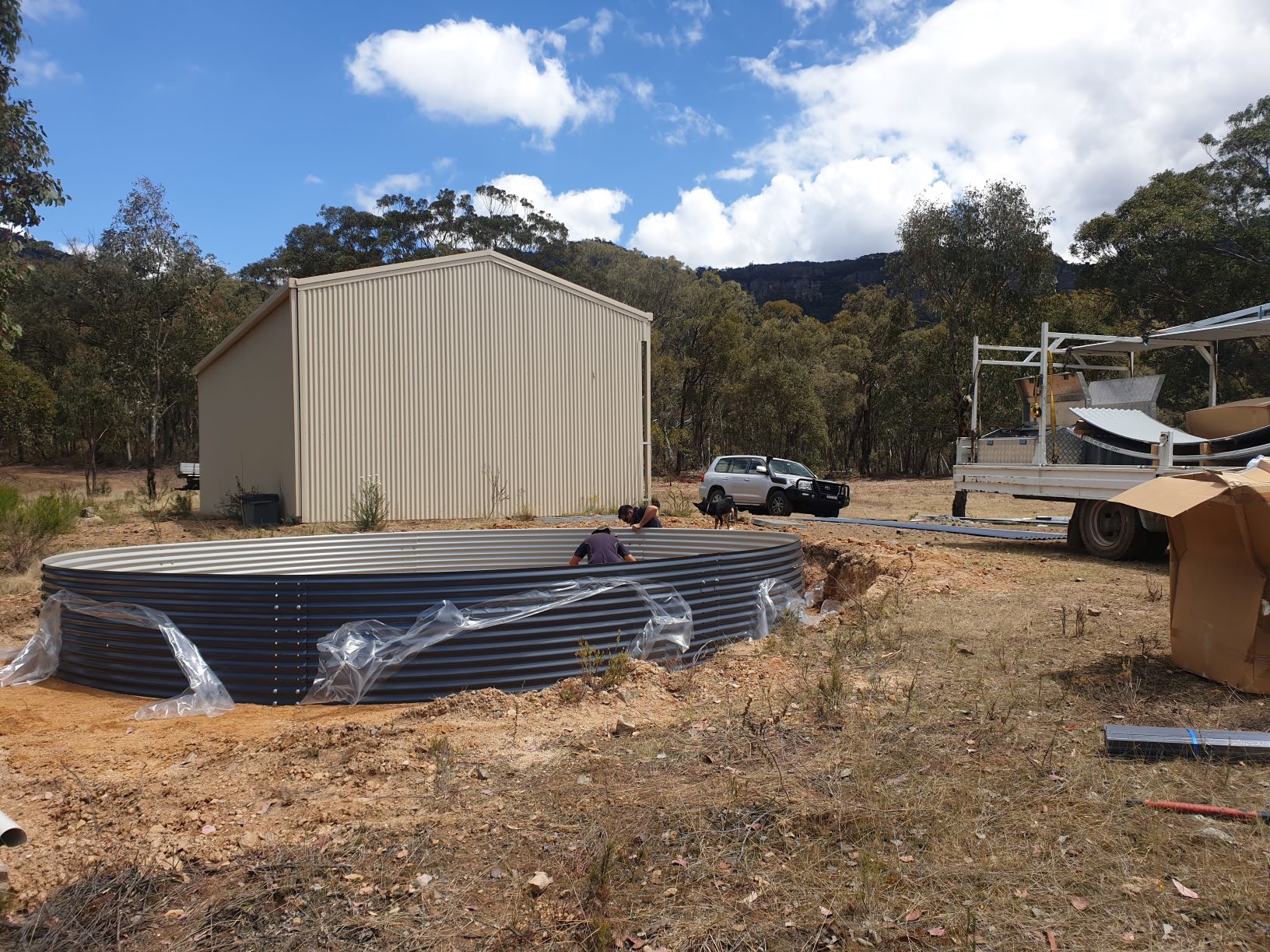 The water tank guys came and installed our 80,000 litre water tank – 20,000 litres of which were preserved for the RFS in case a fire ever hit us (hint hint)