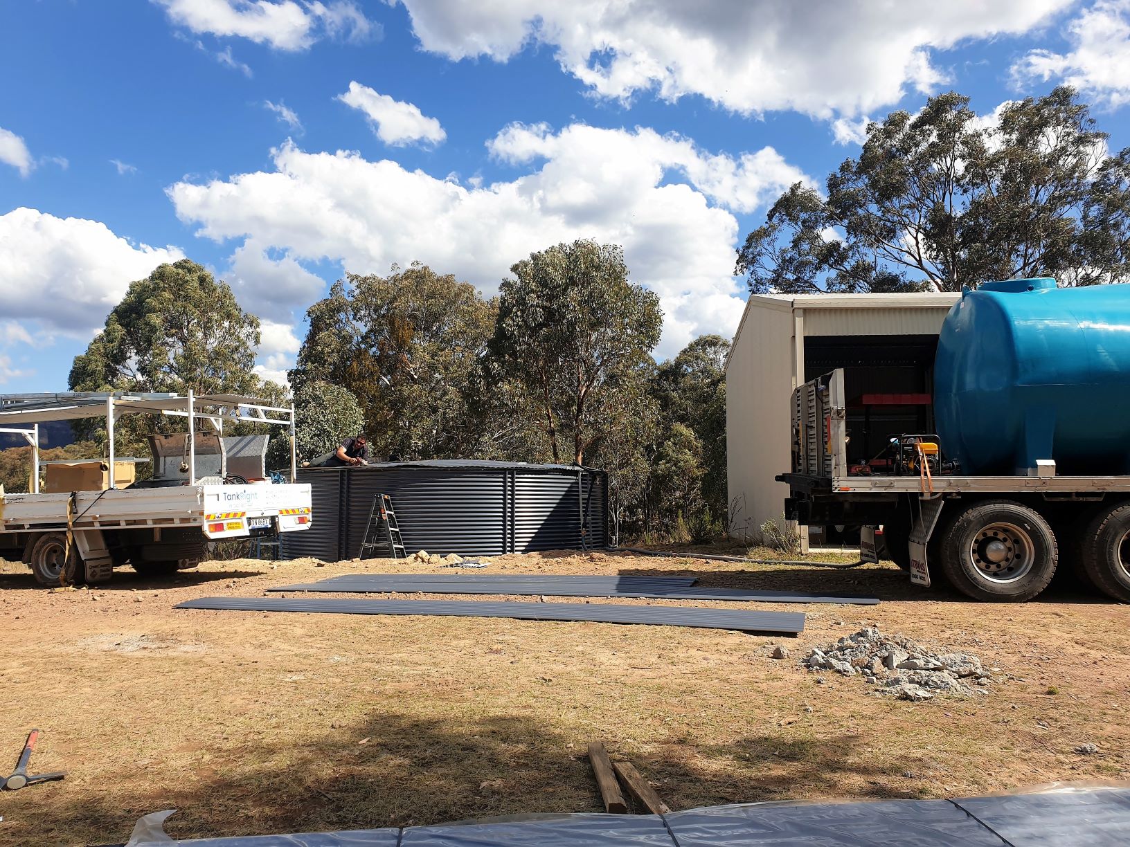 The water truck is pumping 15,000 litres of water into our tank while the guys are still putting on the final touches. You must put in at least 10% of the water at installation to help the tank settle on its base.