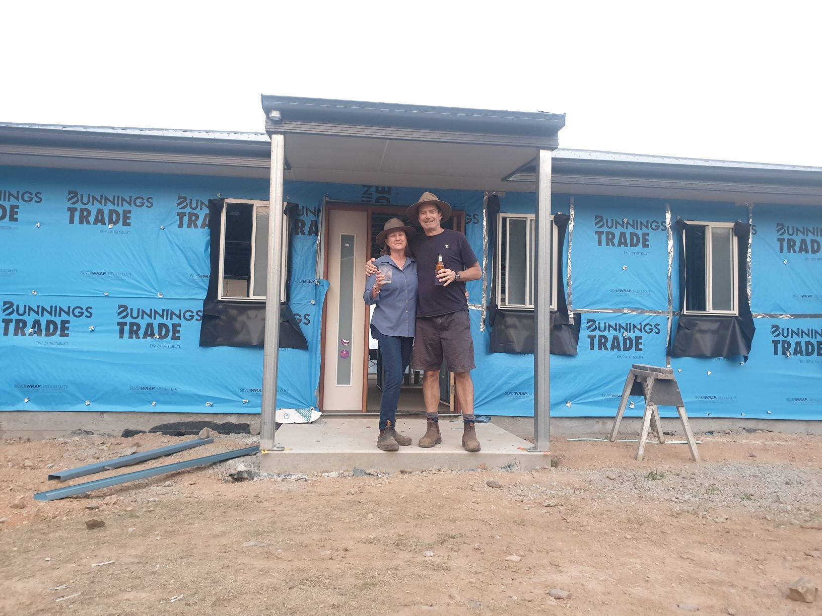 The happy couple standing in front of their half-built country estate…and plenty of hard work to get here.