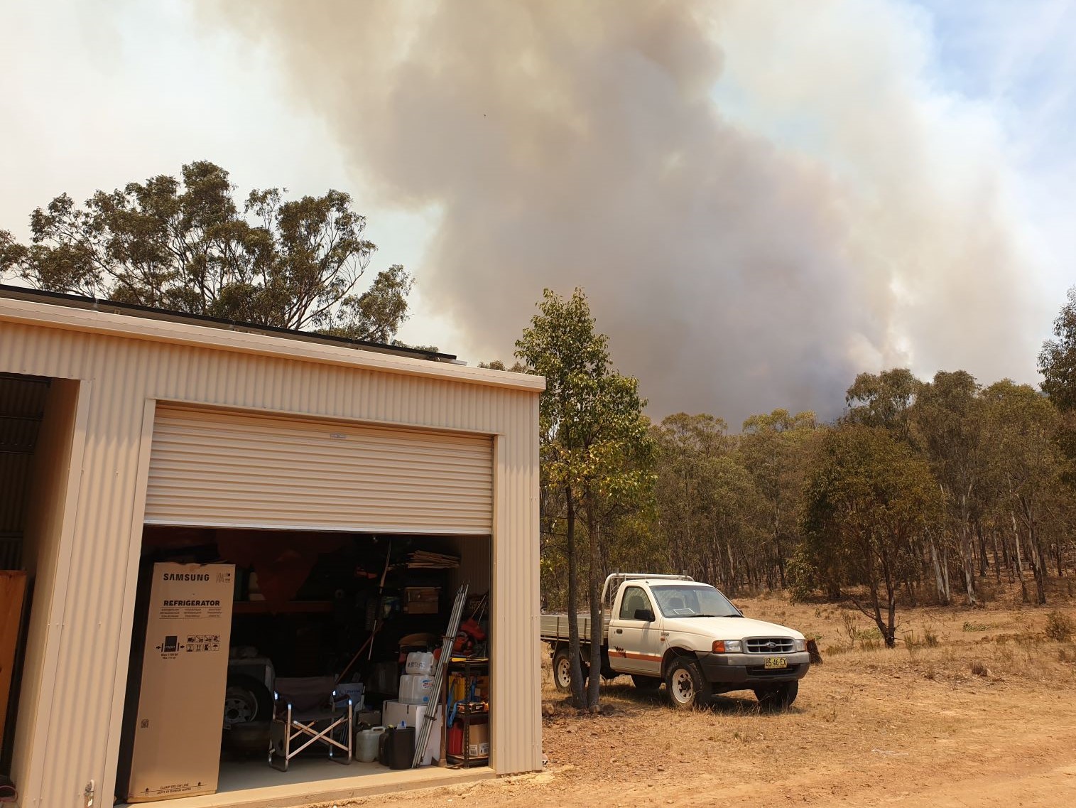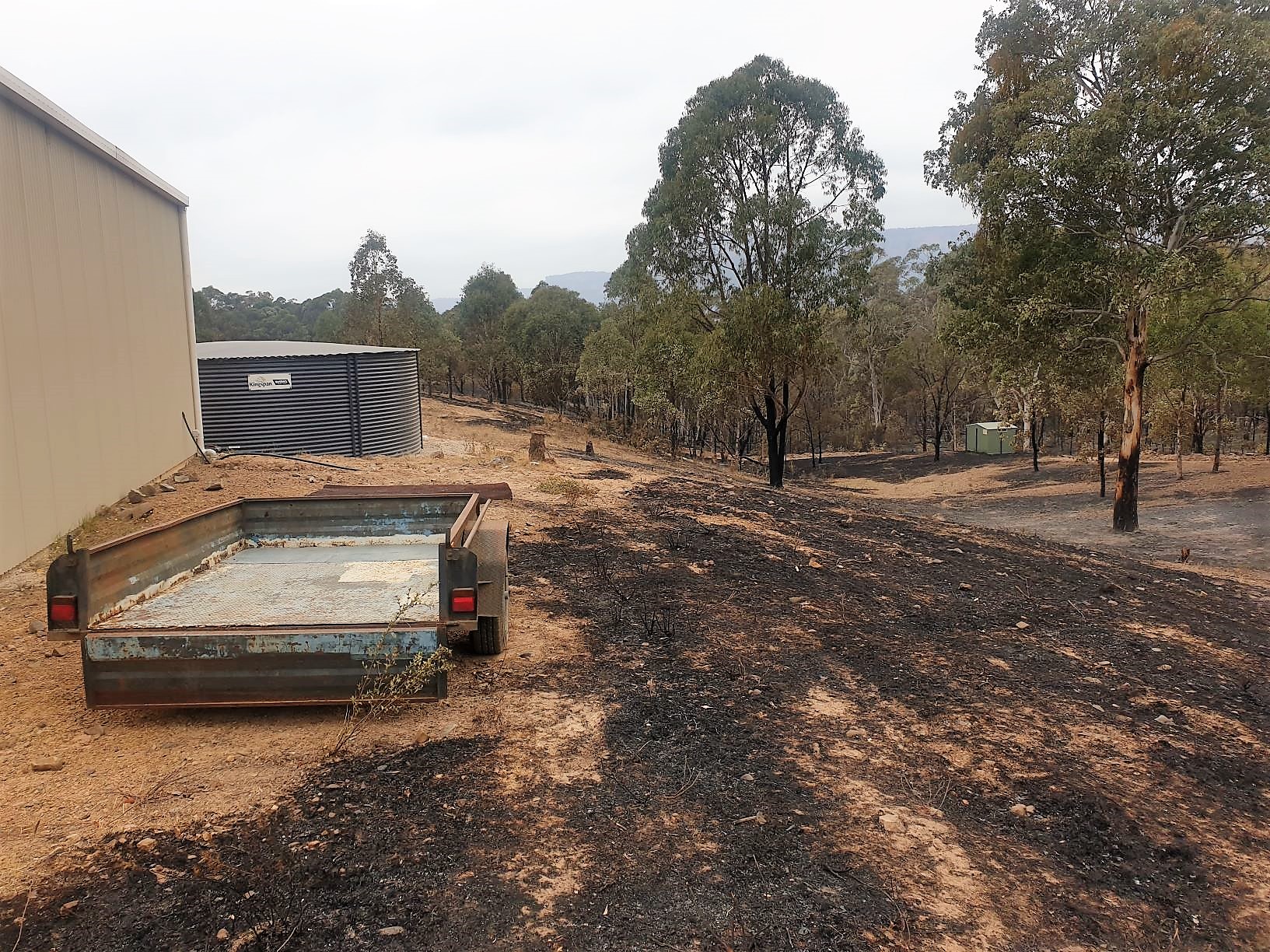 Mission accomplished! You can see how close the fire came to our box trailer, the water tank and the back of our shed before our hard work made sure it ran out of things to burn and died. Note the RFS never came to our place to help save our house.