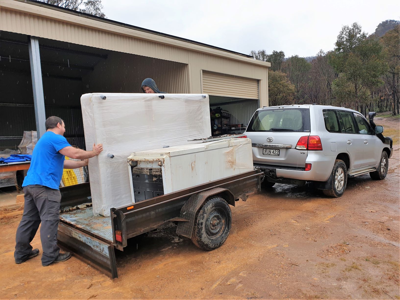 Finally, the big (rainy) day came when we could move our stored furniture from the shed to the house. We called in our family muscle to help do the job.