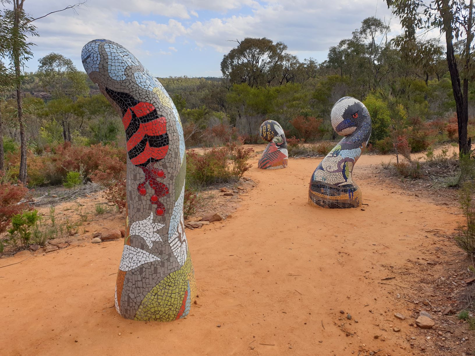 On to Coonabarabran where we picked up supplies, fuel and showers at the local caravan park, then north into the Pilliga Forest and eventually into Timmallallie National Park – as if you’ve ever heard of it – and enjoyed the three kilometre walk along the edge and into the river bed of Dandry Gorge. This lovely late afternoon walk featured dozens of different beautiful flowers and the unique Sculptures in the Scrub where local artists created sculptures that celebrate the local indigenous culture. We camped nearby all by ourselves, our Covid safe distance to other people probably something like 30 kilometres.
