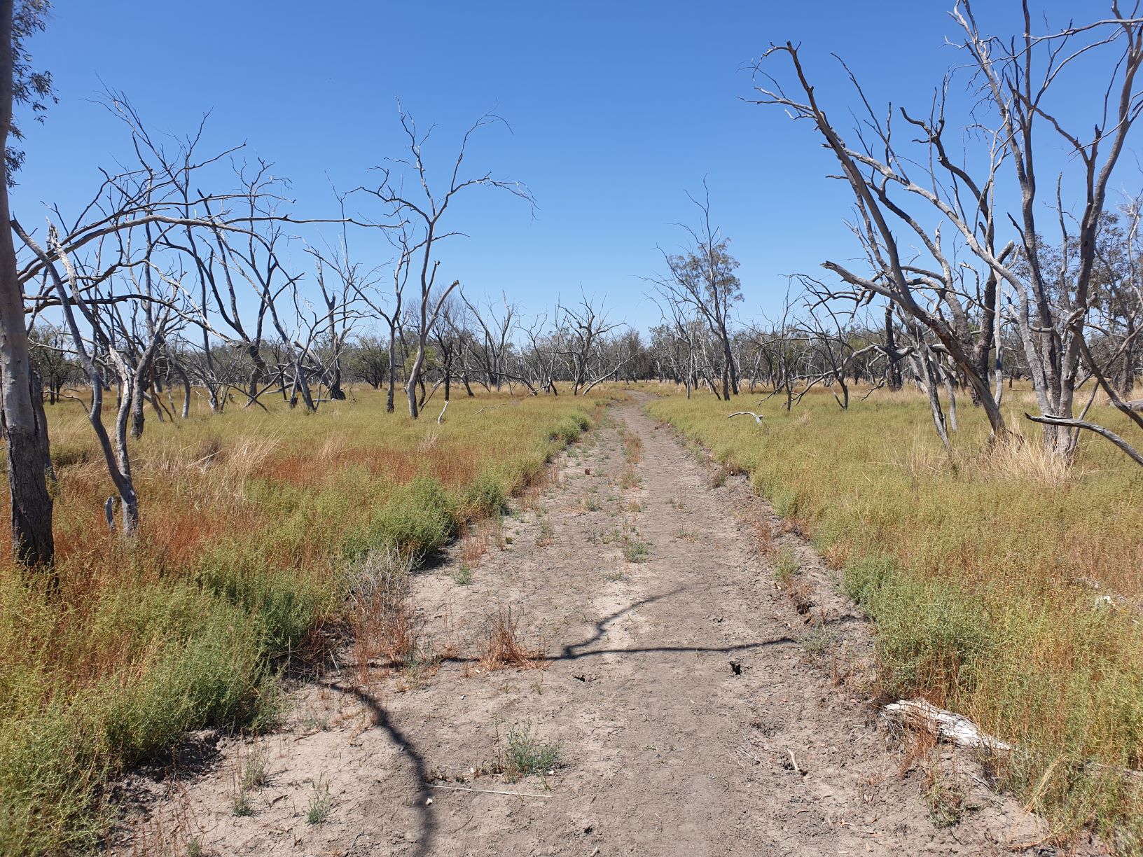 The walk to Culgoa River was a strange mixture of the skeletons of burnt trees, colourful desert grasses and swarming flies