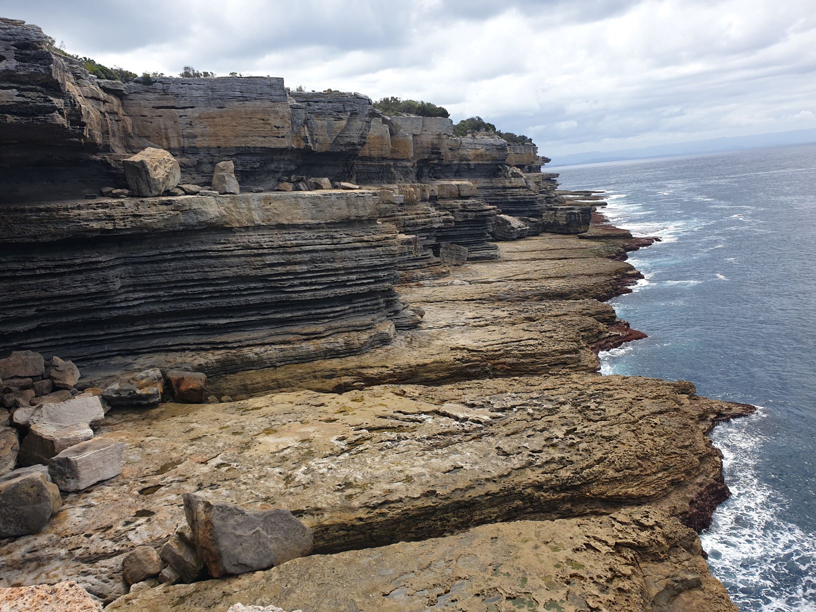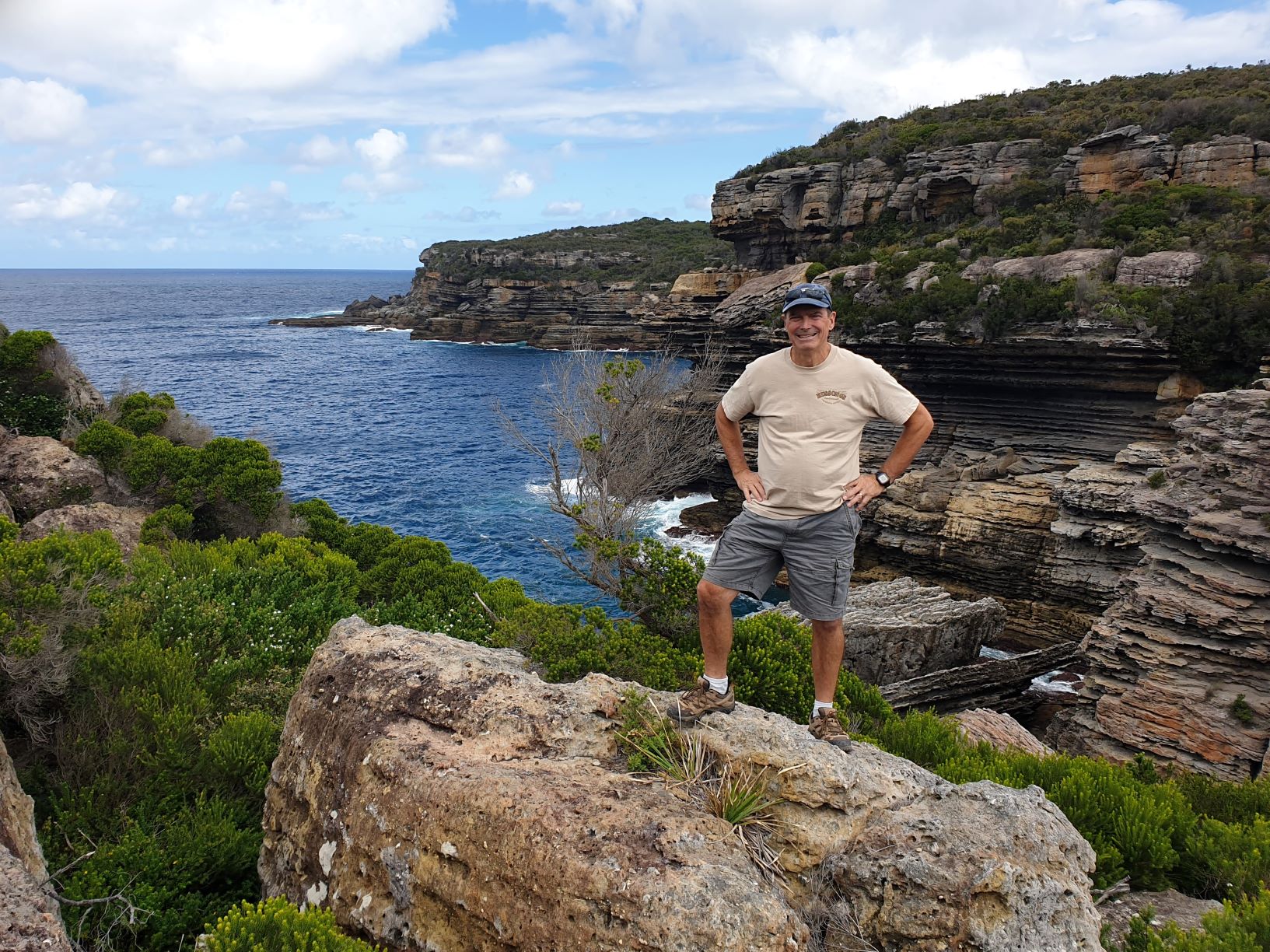 From Coorarong we did a seven kilometre loop walk along the jagged coastline of the peninsula, soaking in the beautiful Aussie bush, the beaches and our return to nature. The highlight of the walk was a natural feature called Gossangs Tunnel which was a small naturally-formed tunnel less than a metre high that started from the inland trail and finished on a dramatic rock ledge 30 metres above the surf. We crawled through the dank tunnel, not easy on our old knees and backs, but were rewarded with spectacular views from a mid-point ledge of this tall cliff line. What a way to start our trip.