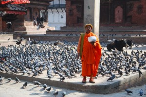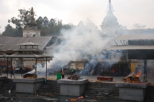 Finally, running out of puff, we made it to the Pasupatinath Temple which is the oldest Hindu temple in Nepal (non-believers can’t go in) and another World Heritage site. But it draws tourists because it is on the banks of the Bagmati River are the ghats which have the most revered (and popular) cremation pyres in Nepal. We stood there for some time in a voyeuristic sort of way watching families say good bye to their loved ones and then someone lighting the fire and burning their dead. To hear the wailing and watch the smoky fires at the base of this ancient temple was quite an experience. Time to move on.