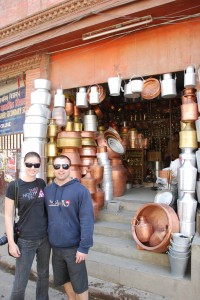 Having said that, Kathmandu has a lot to offer the intrepid traveler and we had a hoot of a time exploring it. First we went to the historical and cultural centre of Kathmandu, Durbar Square, or Royal Square. Durbar Square is where it has all happened since the first temples and palaces were built there in the 16th century and since then has housed Malla and Shah dynasty kings, been the site of royal marriages and coronations and the construction and destruction of various religious temples (depending on the prevailing religion of that time). The architecture is unique to Nepal and the overall effect of the whole area is quite compelling. We admired the unique temples, went into one of the royal museums, a bit dusty, and admired the local shops selling a variety of colourful items to locals and tourists.