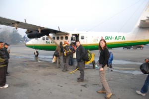 But Lukla is frequently covered in cloud, which our little twin prop plane can’t see through so as to avoid those big bad mountains, so we waited and waited (Arjan said it was ‘too much foggy’) until apparently someone said it was clear enough to manage the 30 minute flight. So 15 of us trekkers from around the world crammed into this tiny little plane, all rugged up against the early morning cold, all anxious about this little aviation adventure and hoping the clouds behave themselves.