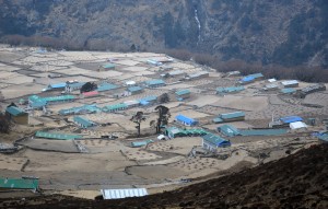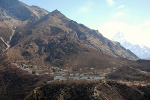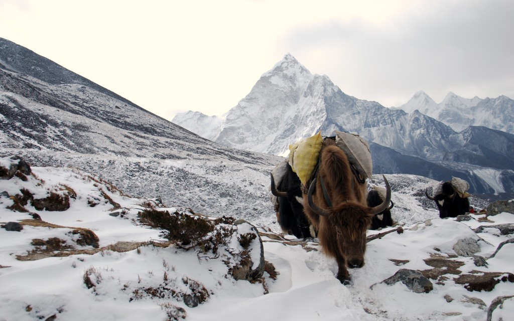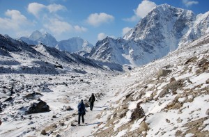 We walked down this new valley with its thawing creek and slowly melting snow, passing through the small village of Periche with its old stone buildings and majestic mountains all around it. This valley was dominated by the Cholatse and Taboche peaks to the west, both over 6,300 metres, and the massive Chola Glacier that flowed down the mountains almost to our feet. From there we climbed over the modest Periche Pass and then followed a high mountain trail which was mainly used by locals and their animals before reaching the village of Syomare. We stopped here for lunch, made memorable by having to clear our table when a string of heavily burdened dzos came romping through the grounds.