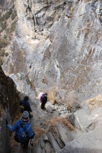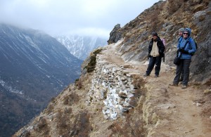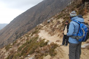 Clouds rolled in below us, then hit us with some snow flurries – yes, still bitingly cold – and the wind blew hard to keep the temperatures very low. But around 4.30 in the afternoon we rounded a corner to see the isolated mountain village of Phorche on a flatish slope on the mountain and we eventually made our way to a modest lodge for the evening. It was a tough day, a long day but a spectacular day along this cliff walk with the wild animals and the beautiful mountains.