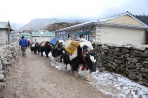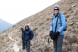 After cleaning our teeth with the resident yaks in the paddock we headed out on a crispy frosty trail, down the steep track losing 200 metres and crossing the raging Dudh Koshi River on a little bridge. From that low point we followed the trail up and relentlessly up, switch back up and up, using all the ‘going up when we’re supposed to be going down’ jokes, long grinding steps, hard work.