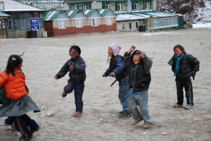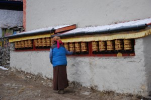 Once it did we rugged up and spent the time exploring the town, made famous as the home of the Sir Edmond Hillary school. The ruddy-faced kids were quick to run up to us and practice their English and show off. We set our sights on walking up to the town Gompa (monastery) which we could see on the other side of town. But we had to solve the rock wall maze of narrow tracks between the potato fields, grazing yaks and humble stone homes before finally finding the secret path. The Gompa had colourfully painted prayer wheels and window frames and it looked out over the little town square which was popular that afternoon because the town residents had brought their large water containers to fill up from the public water source.