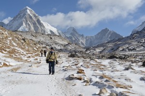 The grim grey snowy weather from yesterday – our summit day – was long gone and we trekked under beautiful blue skies and the full panorama of the Himalaya surrounding us. There was a thin layer of snow covering everything around us and it made the day picture perfect. The air was crisp and the walking was brisk as we descended to Thukla Pass where we paused again at the memorials to the fallen climbers, then down past the tea house at Thukla where the Korean group terrorized us a few nights ago before forking off our familiar trail to start an entirely new track for the next couple of days.