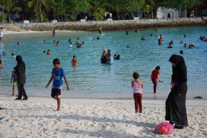 We found the artificial beach area where we saw the local kids and women enjoying a splash in the water, most women swimming fully dressed in long dark chador and head scarf outfit. We had breakfast upstairs overlooking the beach and laughed over the strange situation where the waiter brought out 3 coffees, all different, and three breakfasts for us when our orders seemed fairly clear and there were only two of us. Excellent food and total cost for the three of us was about $14.