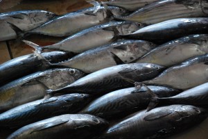 Then into the fish market, quiet this time of day, but still good piles of colourful fish, including mackerel, skipjack tuna and huge yellow fin tuna. The highlight was the fish mongers who used a sharp knife and magic steel gloves to quickly skin, clean, gut, slice and dice fish after fish for the waiting shoppers. Quite a scene.