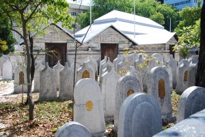 We walked past Jumhooree Maidhan, the main park in front of the Presidential Palace, with its unkempt dusty appearance and huge flag pole proudly flying the Maldives colours, into the Sultan’s Park, which is now a rundown botanical garden, to the modest 17th century Friday Mosque surrounded by a very cool cemetery with its picturesque headstones, and finally back to our hotel, three solid hours of absorbing all the colour and flavours of Male without fainting from the heat. And we loved what we saw!