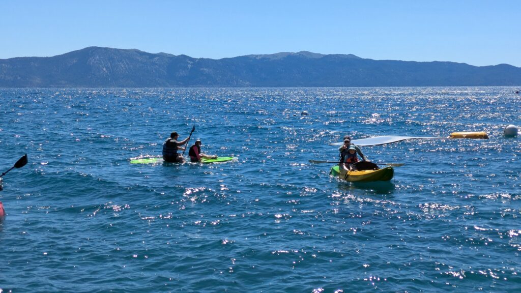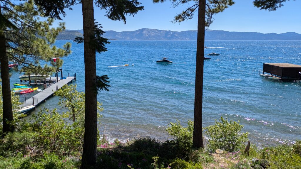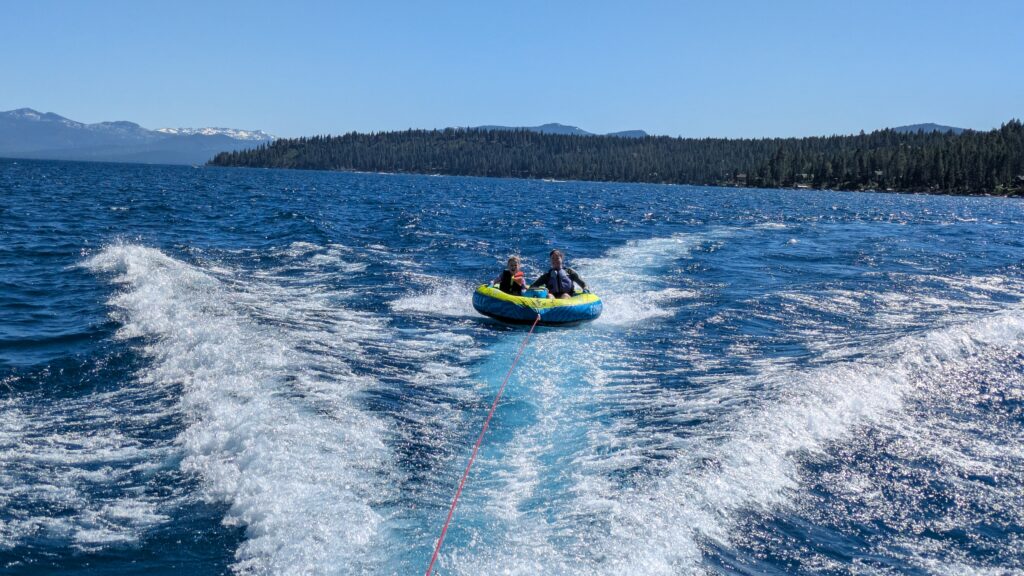 Lake Tahoe sits at about 6,200 feet (about 1,900 metres), surrounded by much taller mountains, some of which sport world class ski resorts for the winter months. It straddles California and Nevada and is the largest alpine lake in North America. This time of year the skiing is behind a boat skimming across the deep blue water but other family options include kayaking, stand up paddles, brief swims in the cold cold water or perhaps a combination of all these. It’s summer, you’re at Tahoe, life is good.