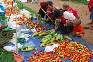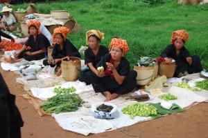 Most of the goods traded at this market were simply laid out on a mat in the dirt, sometimes with primitive scales using old batteries as their counterweight. It was mainly fruit and vegies but also tobacco, dried fish, homemade soaps, cloth and various second hand clothing. It was made more colourful by the costumes of the various tribes people, especially the Pa-O (our favourite) whowrap very brightly coloured towels or shawls around their head. Oh yes, we took a couple of photos.
