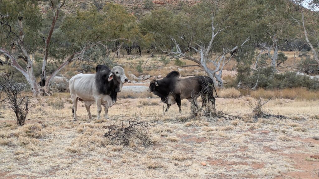 And here we had another first – the camp was already inhabited by three humongous Brahma bulls, as big and threatening as we would care to meet. Runaways from a nearby station, they lingered all day and night, more out of curiosity and the power of possession than any menace, even getting to within a couple of metres of other campers’ tents before Hoppy and I gently shooed them away. Now we’ve seen it all.